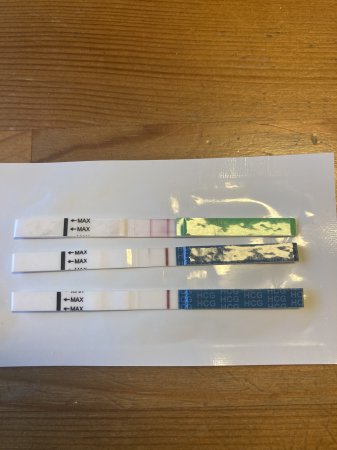 ser strek på de, men etter 4 års prøving og oppstart med IVF over nyåret så klarer eg ikke helt å tro at dette kan være begynnelsen på noe.. Noen formeninger? Den nederste er når testen er tørket.