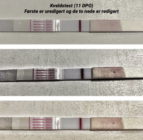 Jeg ser streken, men er jo bra hvis du er bare 7-8 DPO da vil den jo bli sterkere om et par dager tenker jegHva tror dere? Tror jeg er 7/8dpo. Det mørkeste er redigert.