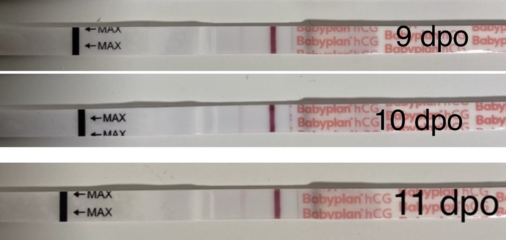 Om du ser på babyplan sin, så er det tydelig økning fra 9 til 11. Det er jo hver 2. dag hcg skal doble seg, og strimler er ikke det beste for å måle stigning, ihvertfall ikke når du tester daglig.Syns babyplan-testene har veldig dårlig stigning. Noen som har erfaring med dem og vet om det er normalt? Hadde det ikke vært for at make sure sine tester er fine så hadde jeg trodd dette ender i kjemisk, men fortsatt lite håp enda.