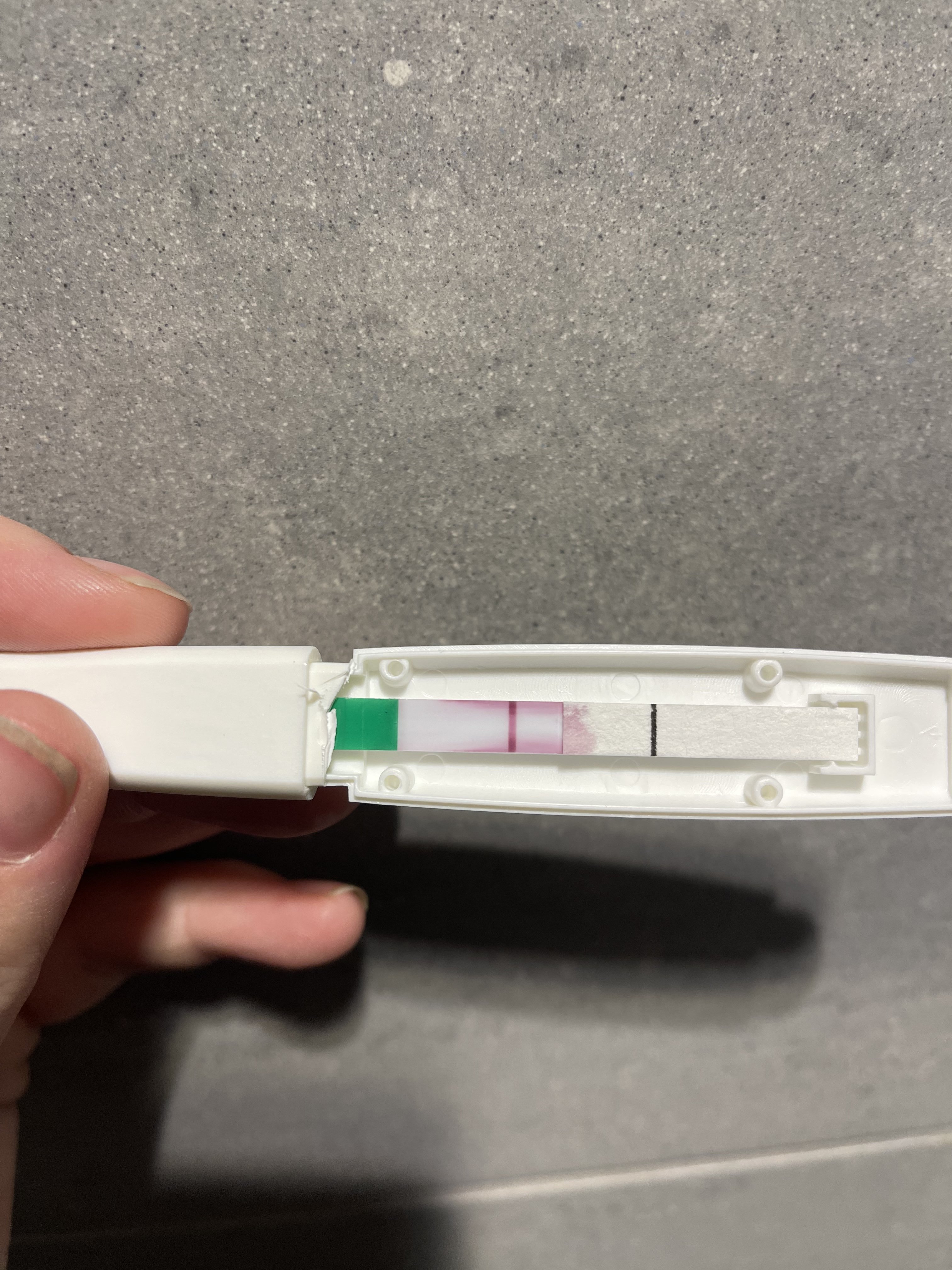 Noen som ser noe her?Føler jeg ser en ganske «tydelig» strek. Men ser ikke om det er farge på. Ganske sikker på at jeg ikke er gravid. Har enda ikke fått mensen etter fødsel. Og er over to uker siden vi hadde sex,så skulle vært mye sterkere strek hvis den var positiv.