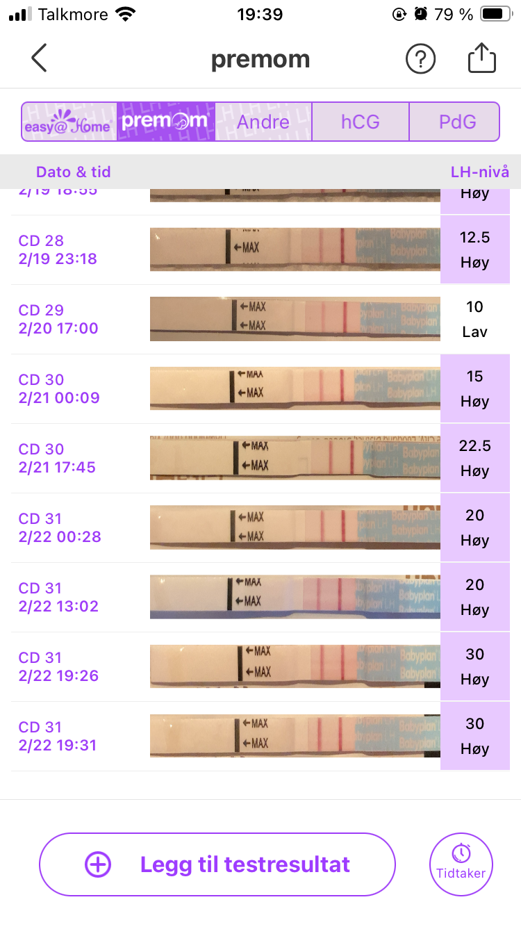 Temper og fikk sterke tester og maksimal på Clearblue fertilitetsmonitor 16 og 17 februar. FF peilet El 16:de. Det kan jo selvfølgelig være feil, men syns det er rart med så mange feil på både tester og annet. Har hatt typiske mensmurringer igår å dagen før. Trøtt og sliten, sovner raskt på sofaen. Men er vel ikke min tur denne gangen heller. Det som er litt merkelig er at den testen som slo sterkest ut var en 25 ml, mens de andre som også har slått ut har vært på 10 ml. Men de har vært svakere enn den på 25 ml ❤️ Dumme kroppen og sinn.