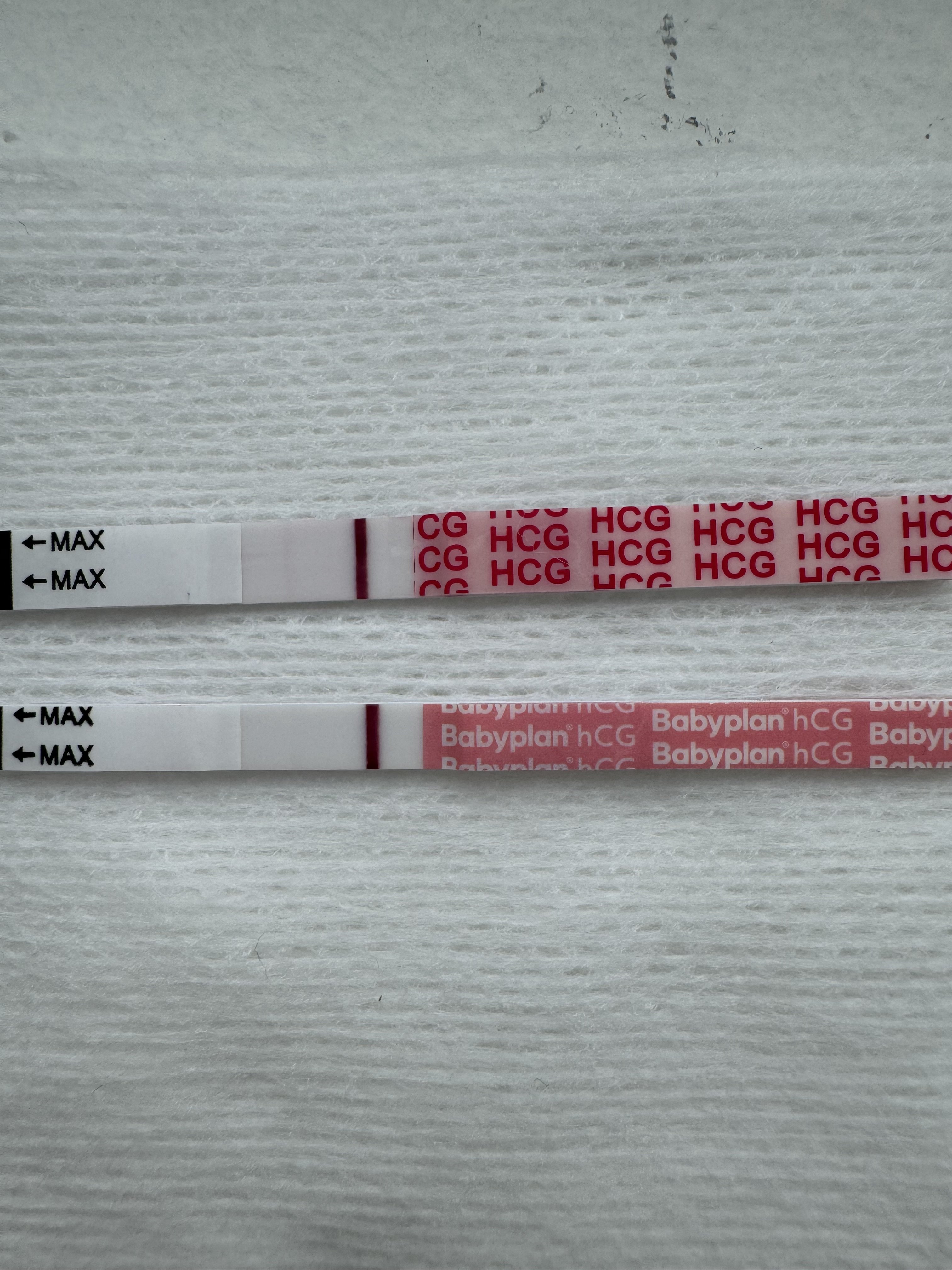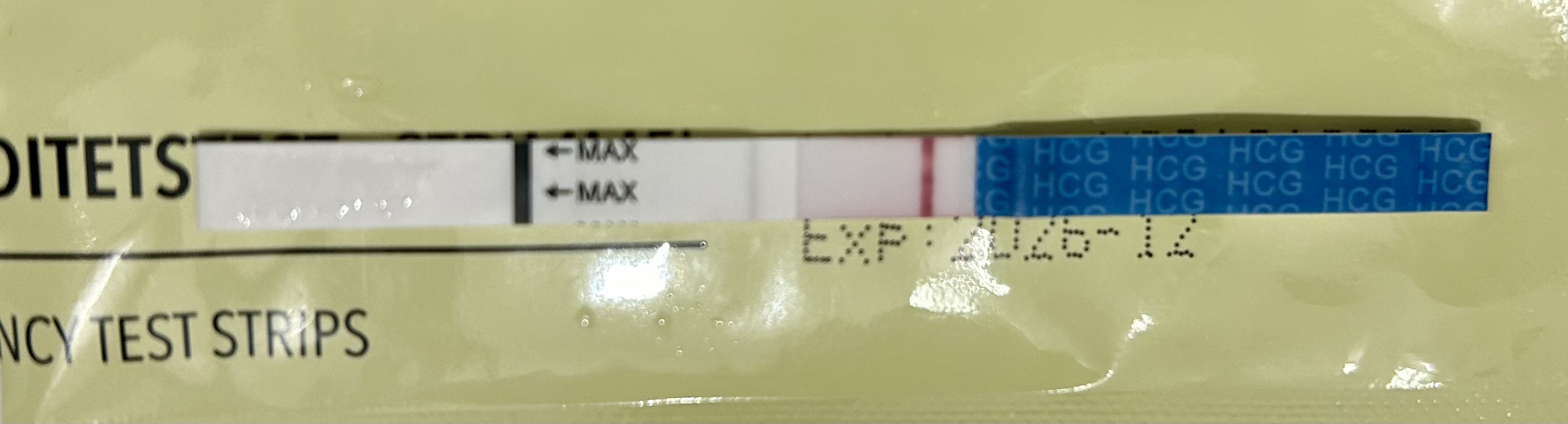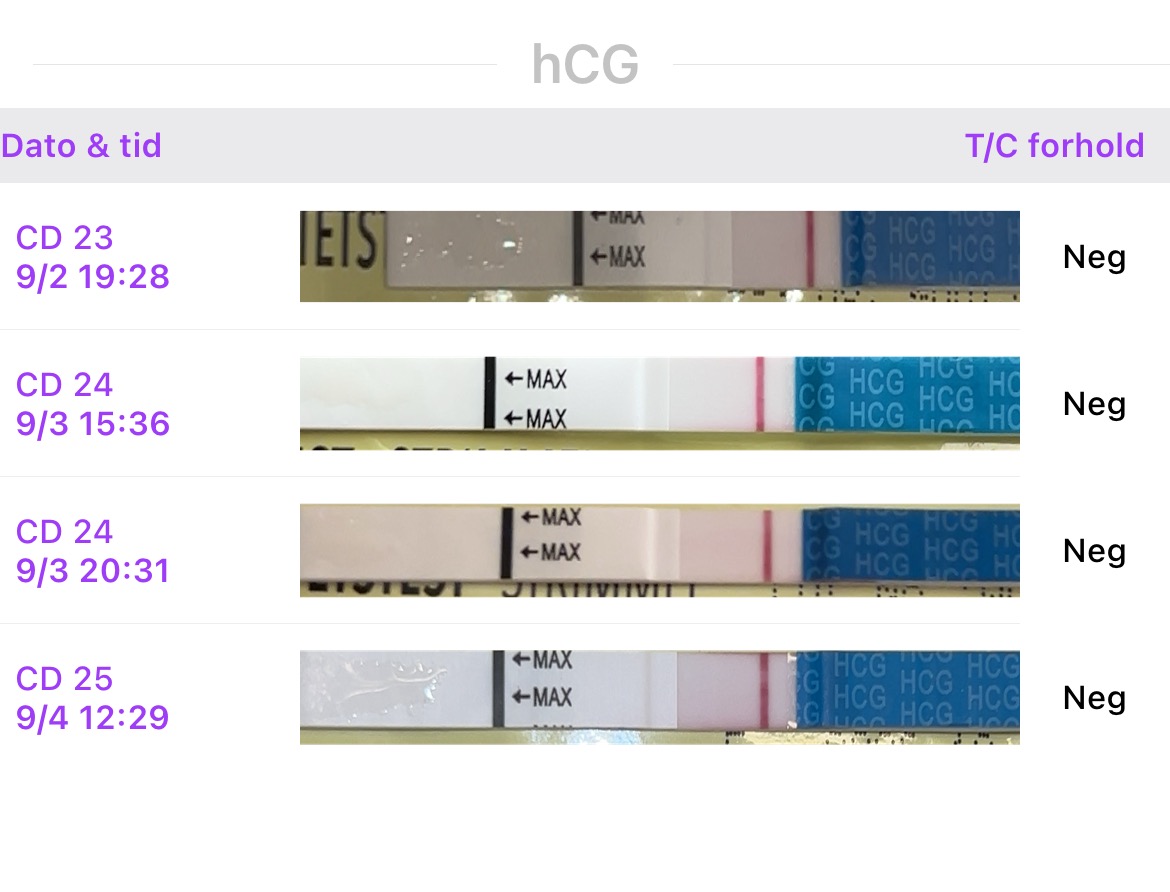 Jeg testet både mandag og i går. Testen på mandag var rimelig blenda hvit, men syns jeg kunne skimte noe ultrasvakt hvis jeg holdt testen i rette lyset og i en gitt vinkel… men redd for å gi meg selv falske forhåpninger.
