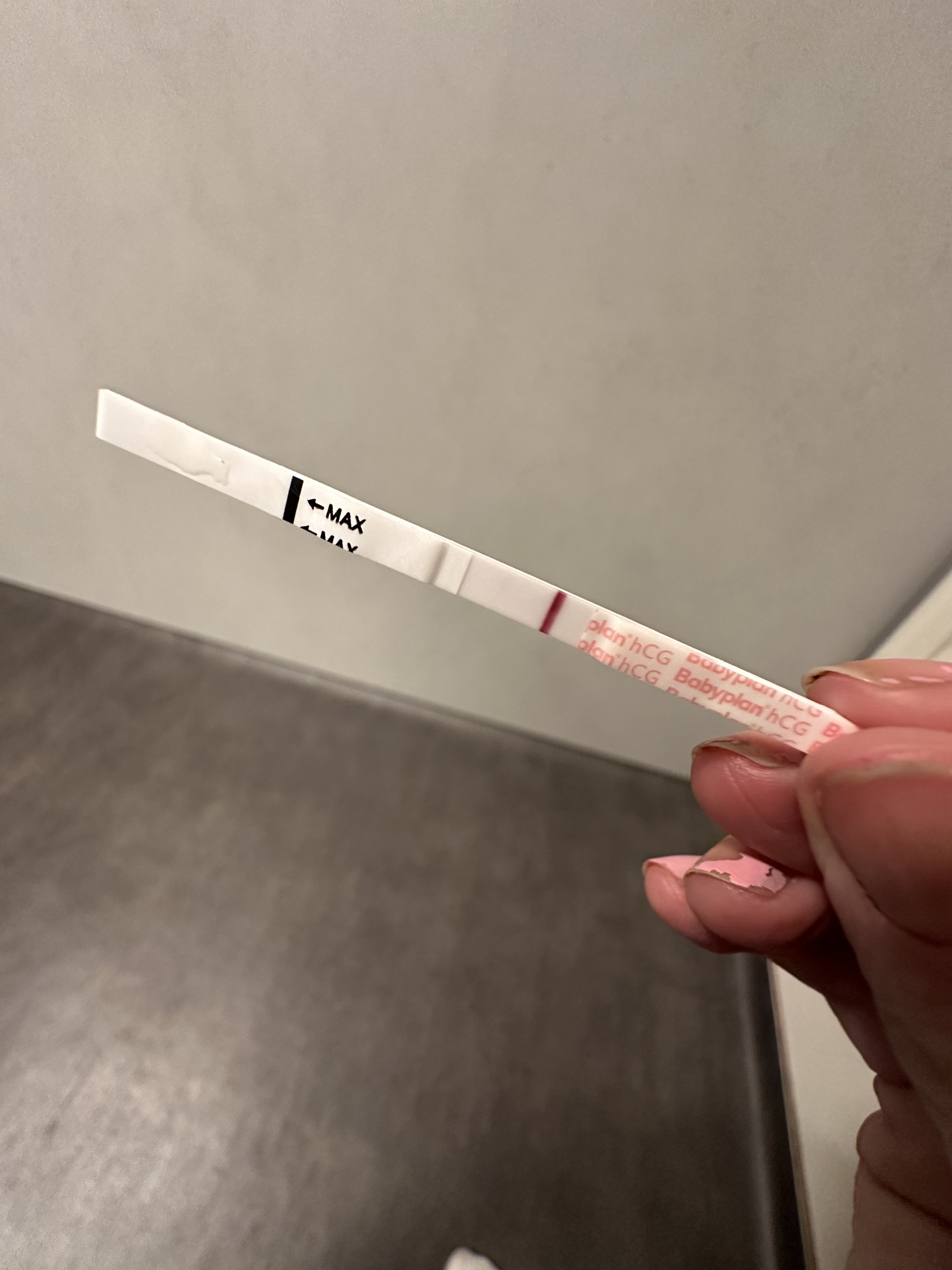 Jeg tror jeg så en svak strek i mårres, men jeg er usikker. Skal ta ny i morgen. Det er 2 uker siden spiralen datt ut i morgen.