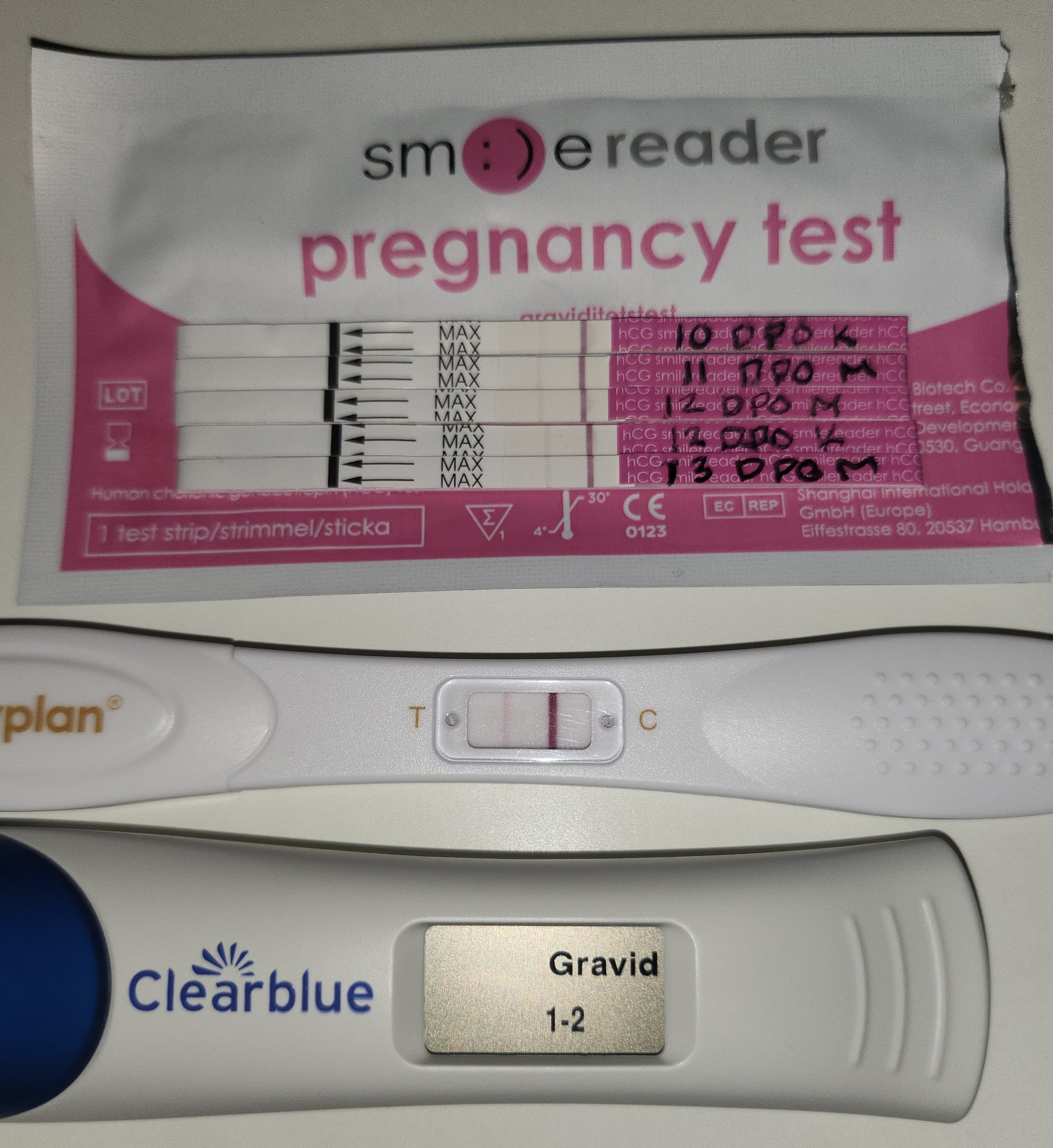 Kunne skimte en strek også når testen var tørr. Noe de andre ikke hadde. Så veldig spent på morgendagen. Men, siden jeg fikk positiv ved 10 dpo sist så føler jeg nesten løpet er kjørt.