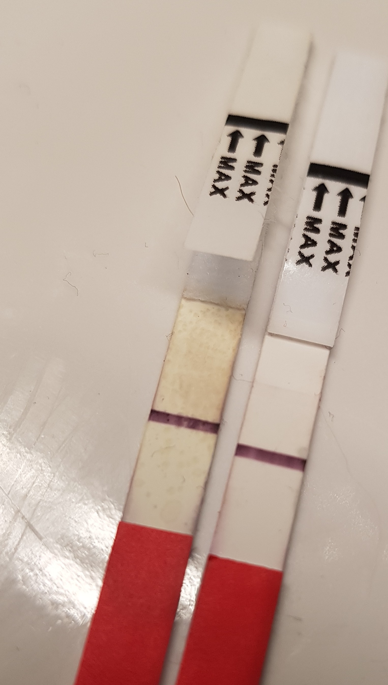 Synes jeg ser noe på den til høyreJeg tror jeg svimer av.. Kan noen se om de ser noe..? Vi har prøvd i 1,5 år, og jeg ser syner tror jeg, og vil ikke si noe til mannen før jeg er sikker.. Den til venstre ble tatt i går morges. Så negativ ut, så jeg kastet den (derfor misfarget og ødelagt). Sjekket den etterpå, og syntes tydelig jeg så en skyggestrek. Den til høyre er fra i morges. Den var også negativ, men fant ut jeg skulle spare den også. Sjekket nettopp, og mener bestemt jeg skimter en svak rosa strek..?! Nå er jo tiden utgått for lengst, og jeg er kun på 10 dpo, etter Ovitrelle fredag 26, og forventet mens er ikke før 14. Men for første gang tror jeg at jeg skimter et håp..?!