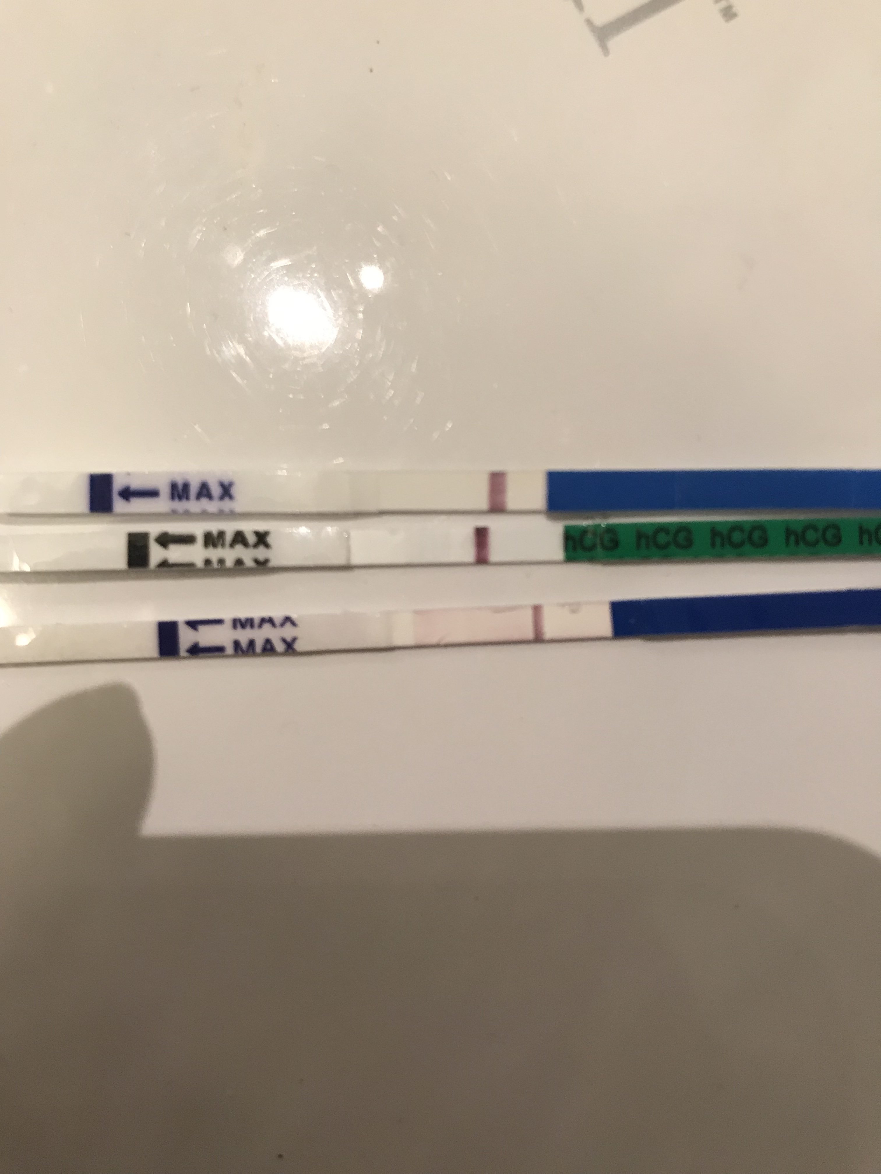 Her er testene fra i går kveld og i dag ettermiddag. Jeg tror ikke noen av de er positive, men at det kanskje nærmer seg? Tør jeg å gjette i morgen eller dagen etter, eller er jeg helt på jordet med det anslaget? Skal teststreken være bredere eller gjelder bare fargen/styrken?