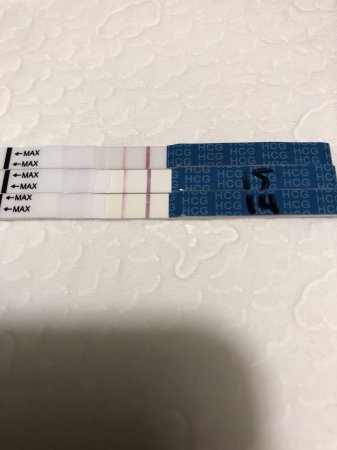 8 dpo på kvelden, måtte jo teste. Forrige gang jeg testet var det blenda, men nå skimter jeg en svak strek innenfor tidsfristen. Den er også tydelig etter at den tørket. Ikke så lett å se å bildet ser jeg. Men det er klart, med kjemisk i januar så vet jeg at dette ikke behøver å bety noe.
