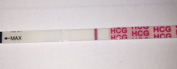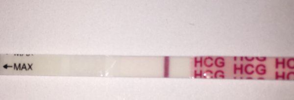 Jeg tar testen, og mens urinen sprer seg er det en svak teststrek som kommer til syne før kontrollstreken. Denne forsvinner før det er farge på hele testvinduet. Kontrollstreken fortsetter å være like sterk. (Jeg ser på mens det brer seg)