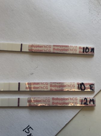 Se 12 dpo morgen kontra formiddagen og kvelden før. Såvidt det er stigning å se fra 10dpo morgen til 12dpo morgen også. Og 12 dpo hadde jeg 33 i hCG (tok blodprøve samme dag). Etter det droppa jeg å teste på morgenurin ... Dette er også såkalt sensitive tester med følsomhet på 10.