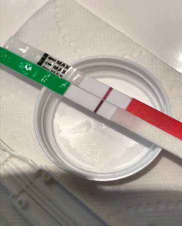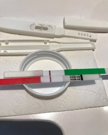 Kan være fargestoffet. Krysser og håperHjelp! Fikk positiv test i går kveld (ikm), men i dag morges er den litt svakere. Kan dette være kjemisk eller er testene mye svakere da?? Testen fra i går er den nederste, og fra i dag den øverste.
