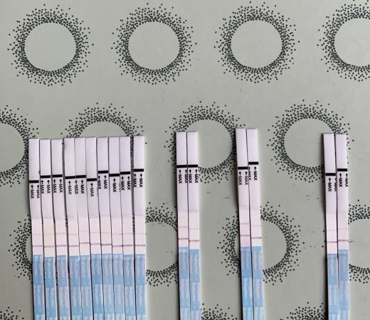Finn blinkende smiley for to dager siden. Etter det testet jeg morgen og kveld hver dag. Er på CD23 i dag. Kan det se ut som gårsdagens morgentest var positiv? Syns den er noe svakere enn tekstlinjen, men kan eventuelt stemme med tidligere sykluser. På bilde fra avstand er gårsdagens morgentest testen som ligger til venstre i rekke nummer to med dobbelt test (i midten).