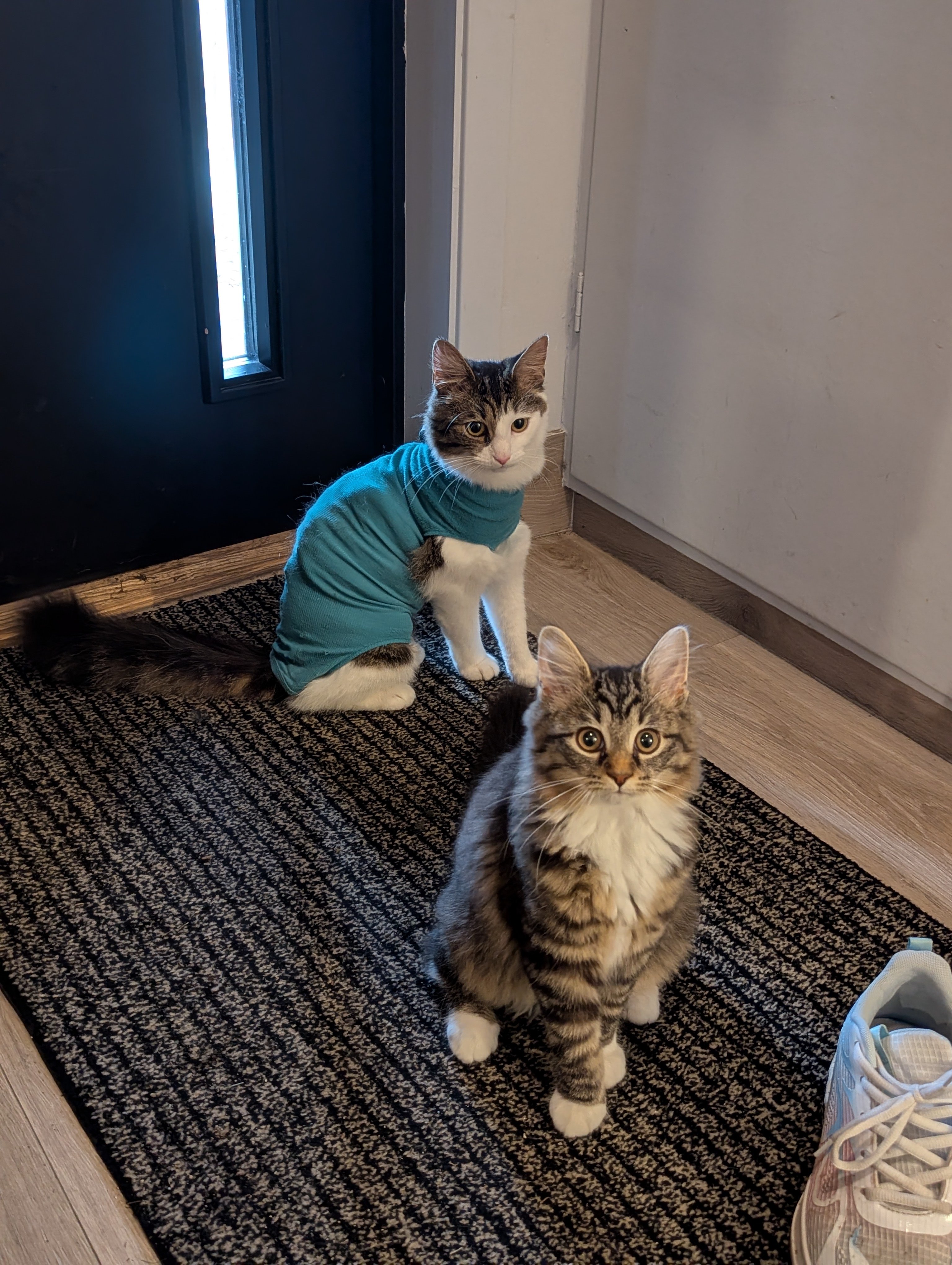 Hentet hjem pusene som har bodd hos min kusine fra vi dro til nå ❤️ (mammapus går med body etter hun ble sterilisert før vi reiste, skal til dyrlegen og ta stingene imorgen)