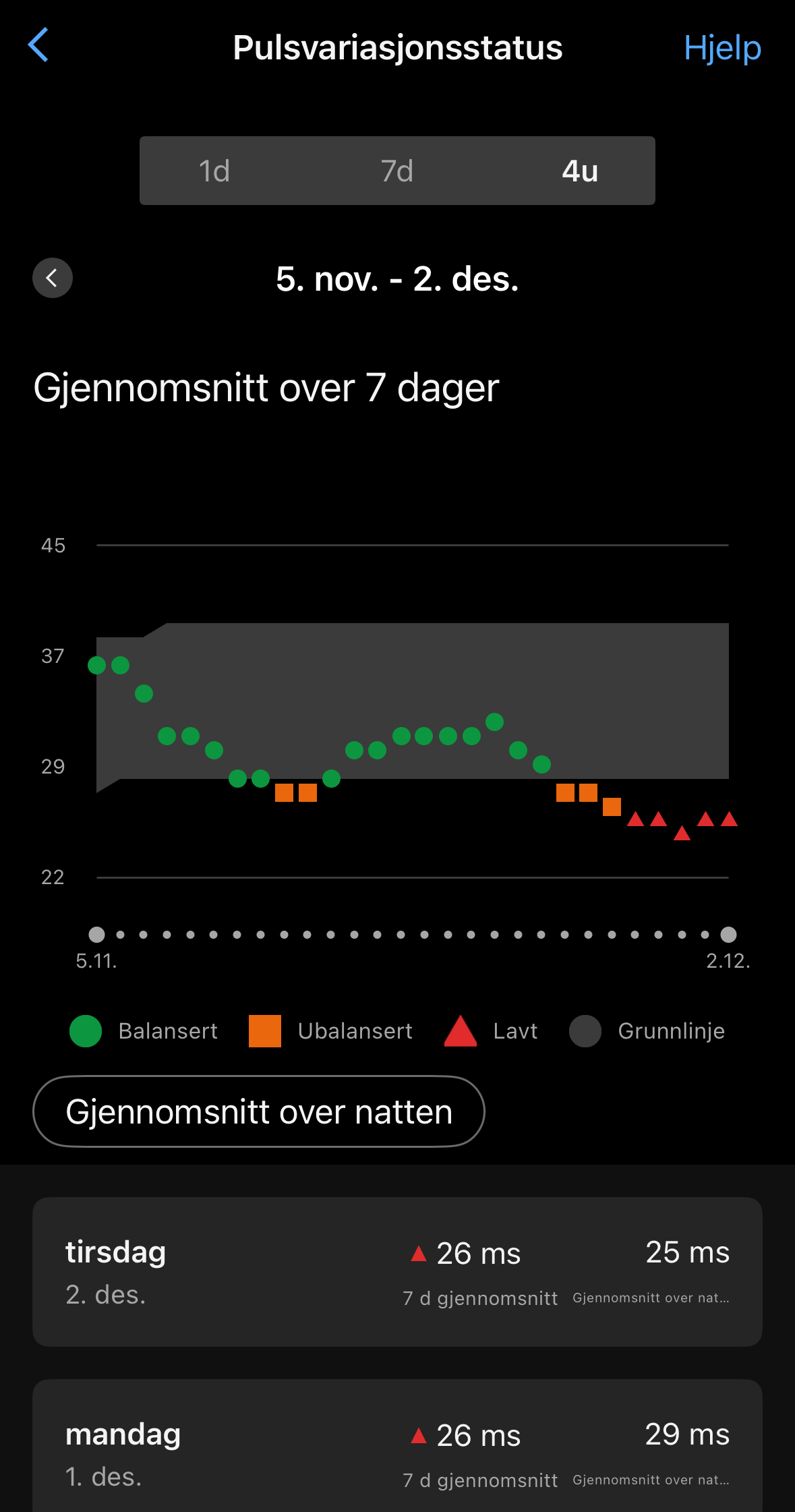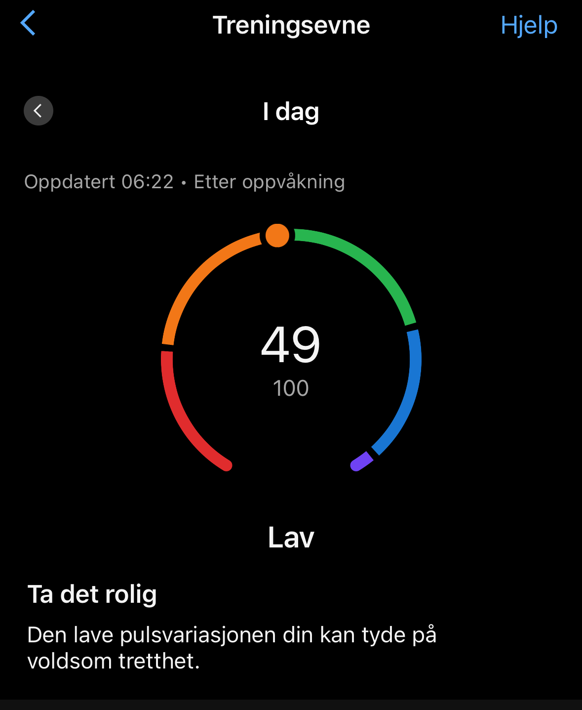 Min garmin varsler om lav pulsvariasjonsstatus når jeg er gravid, det er ikke et sikkert tegn for jeg har hatt det utenom graviditet også men veldig sjelden. Har halv treningsevne men jeg har ikke trent :hilarious: