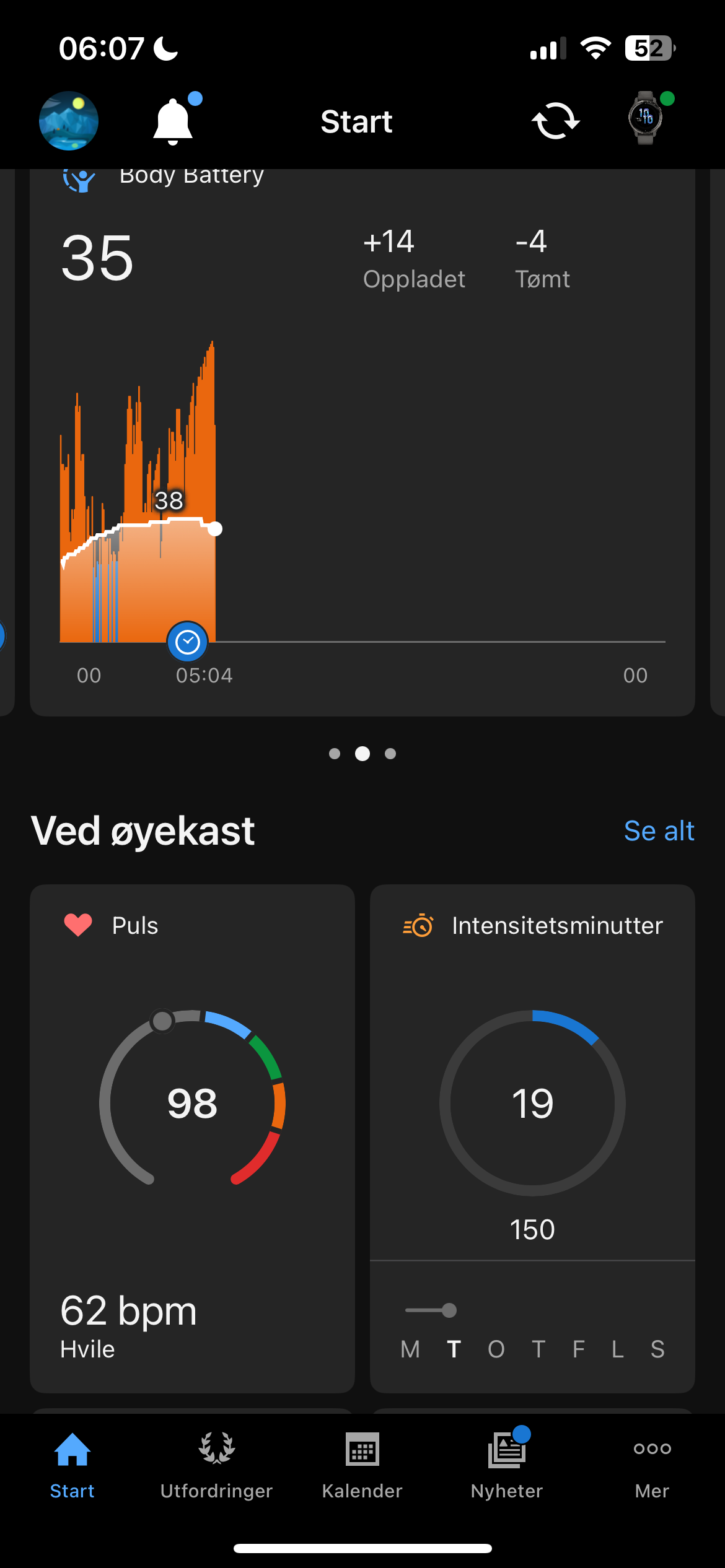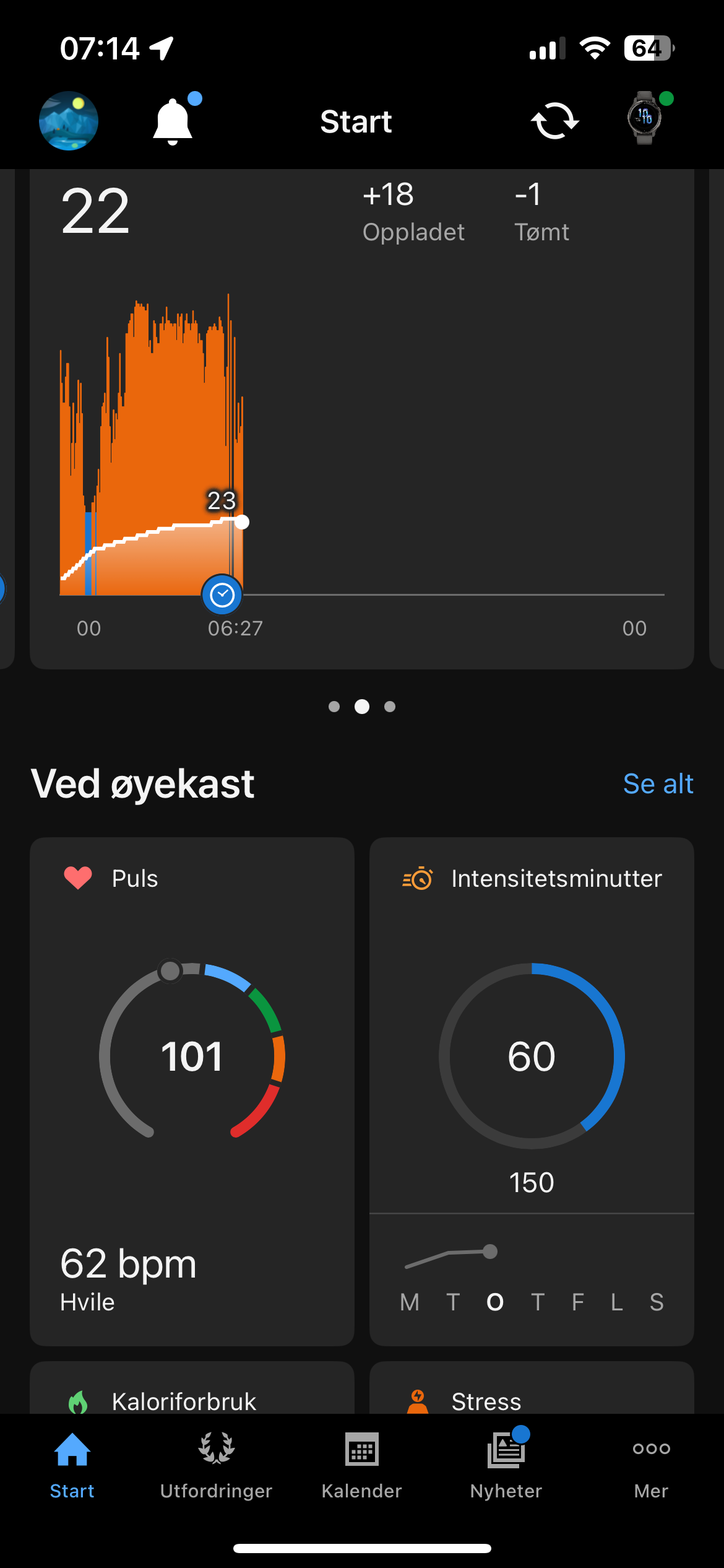 53 i hvilepuls når jeg våknet i går og 62 i dag. Elendig bodybatteri når jeg våkner, klokken sier stressnivået er for høyt. Nesten 100 i puls :p frøse og vært kald i natt. Og varm nå.