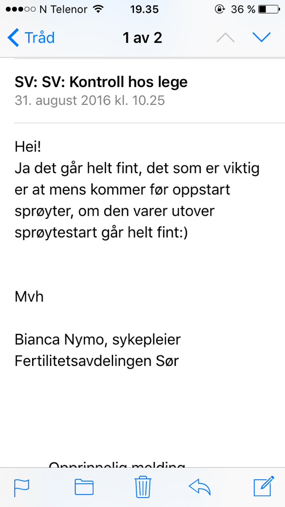 Avbrytelse var ikke noe alternativ heldigvisKjedelig. Det skjedde meg i juni også, da avbrøt de i stedet. Hvilken klinikk er du på?