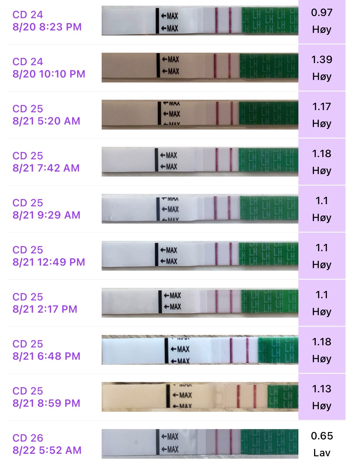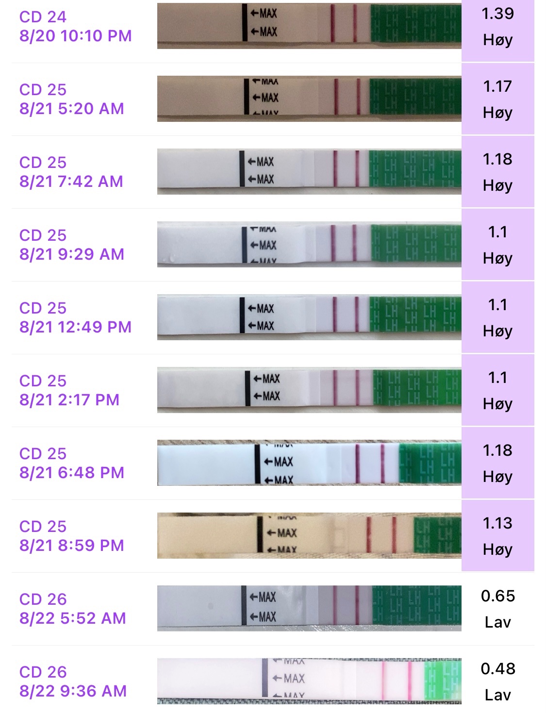 Var det da du ble gravid?Ja!! Sist holdt jeg på i mange dager med veldig høy LH før det stoppet opp, og så gikk det enda noen dager før det skøyt til topps igjen. Da var det 2 døgn med peak.. Og de sykeste el-smertene.