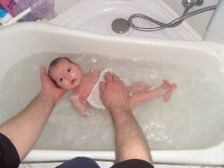 Å så liiita... Jeg sammenligner badebilder, og snuppa di kunne jo hatt med seg et par 3-4-5 andre babyer nedi balja, men min er snart for stor for for hele balja! [:o] [:D]