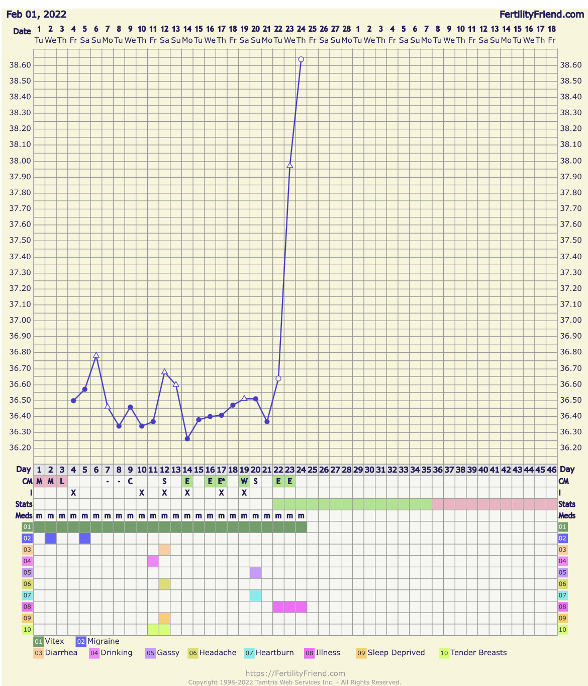 Jeg venter, venter, venter på eggløsning. Hadde litt trua denne uka, pga en del slim men niks. Tempen steg saaaakte, før den droppet igjen i dag tidlig. Jeg har ofte et lite dropp før el, men slimet har tørket inn så det kan vel være at kroppen min har jobbet med noe men ikke fått det til. Ser jeg tilbake på tidligere sykluser, har jeg hatt eggløsning på cd 24, 23, 23 og 28. Det er vel bare pcos'en som f#&Cer til systemet igjen.