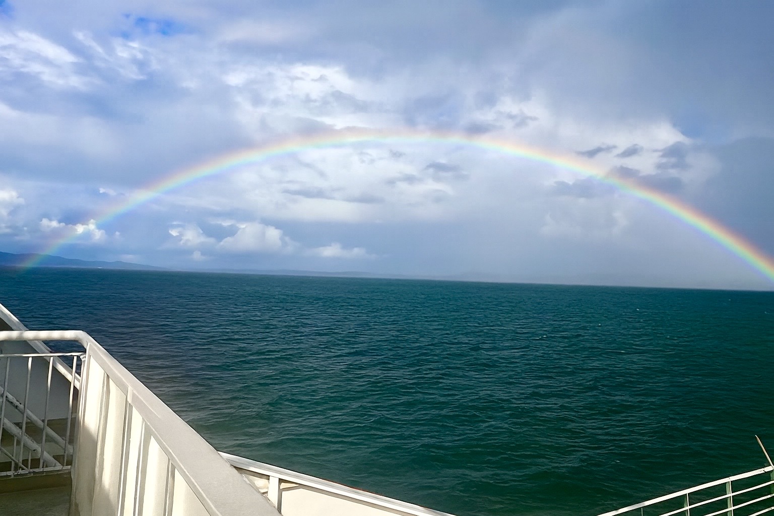 Nå jeg går ut av klinikken, så plaskregner det. Etter 2 min så skinner solen, den steker. Og jeg så regnbuer over alt, de viste seg (2 stykk) på himmelen, bak bilene i vannspruten. Det var nesten så jeg ikke klarte å kjøre bil, for det var så mye vakkert rundt meg.