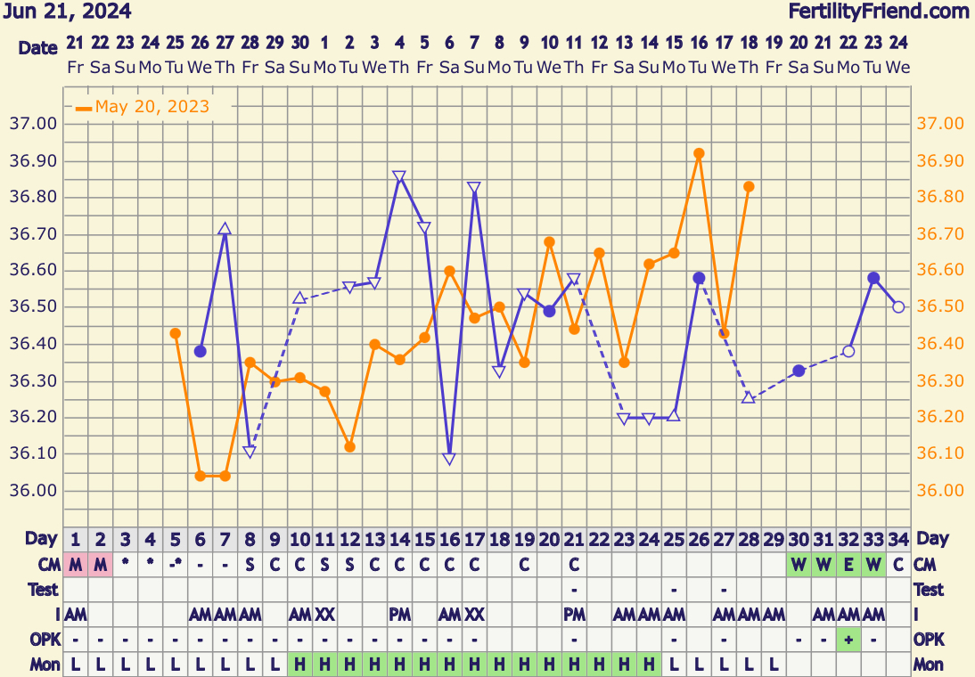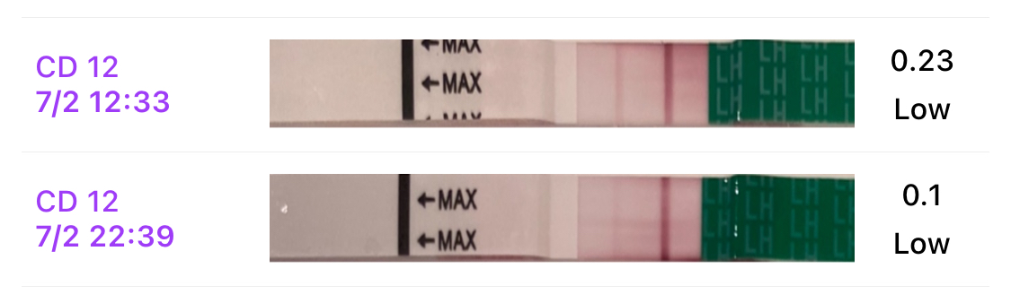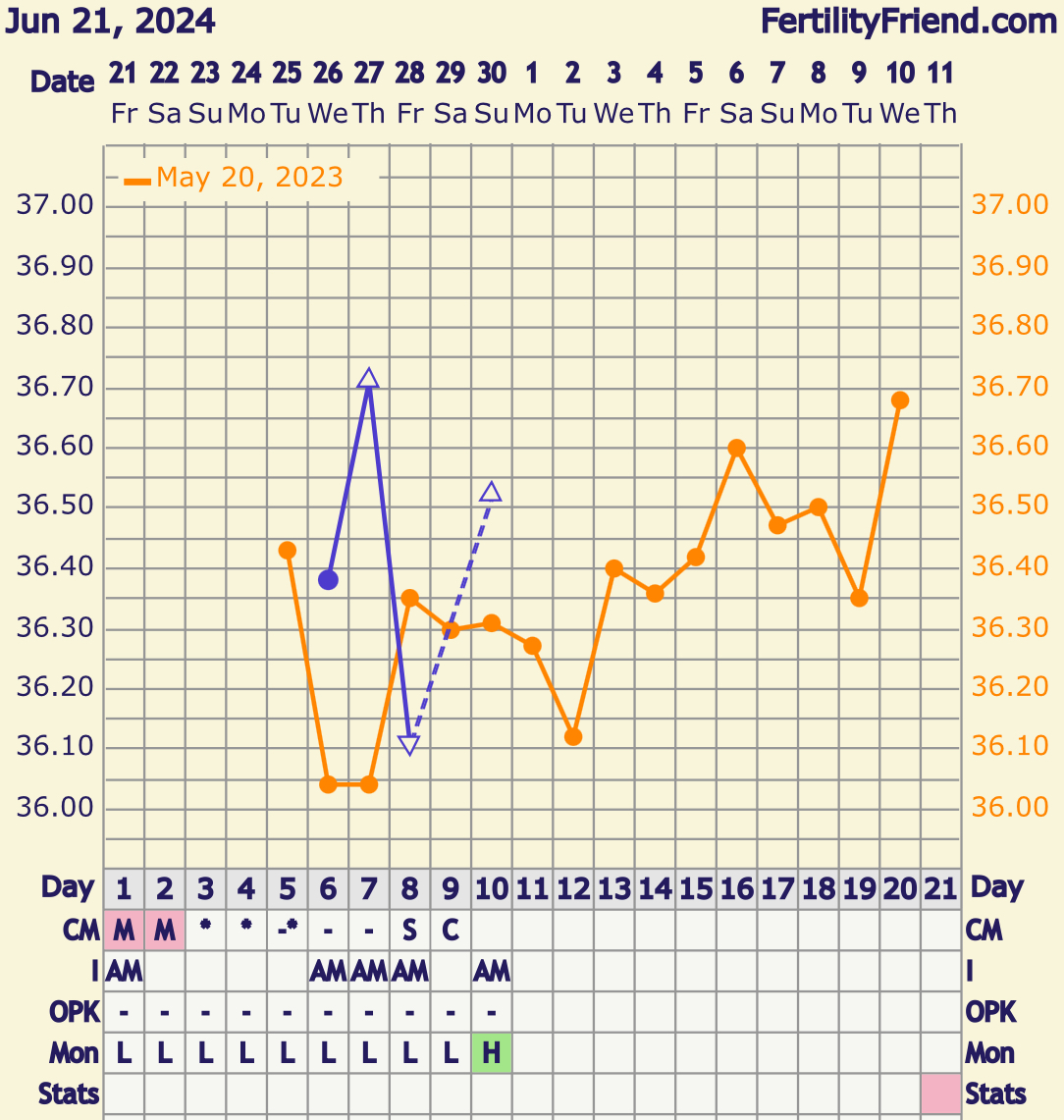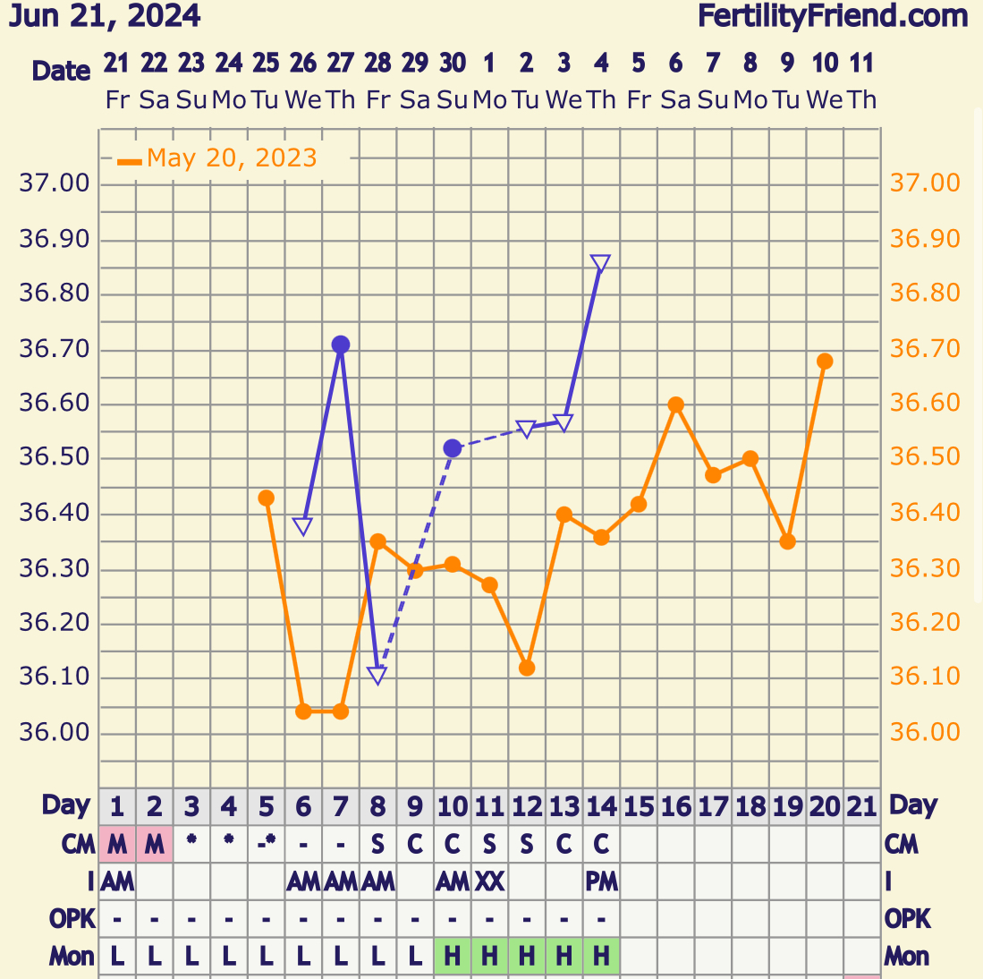Nå er jeg ingen habil monitorbruker men jeg kjenner jo godt til egen syklus etter en stund i gamet. Det vil jo variere fra syklus til syklus hvordan kroppen er både med tanke på temperatur og når en kan forvente å få positive og negative tester. Forrige gang jeg brukte monitor, mai/juni 2023, hadde jeg lav frem til og med CD9. Fra CD10 og til og med CD14 hadde jeg høy-høy-topp-topp-høy. Resten lav. Det var en normal syklus med EL. Ettersom kroppen fortsatt er preget av å ha vært gravid, antar jeg at jeg at jeg i denne syklusen muligens har en anovulatorisk syklus. Dette med bakgrunn i at jeg er på sjette dagen med østrogenøkning i følge CBFM og at jeg enda ikke har fått den nødvendige oppsvingen av LH. Temperaturgrafen tyder på samme trend, så da tror jeg det er enklere for psyken min at jeg slutter å teste og heller venter på at kroppen finner ut når den er klar igjen :)