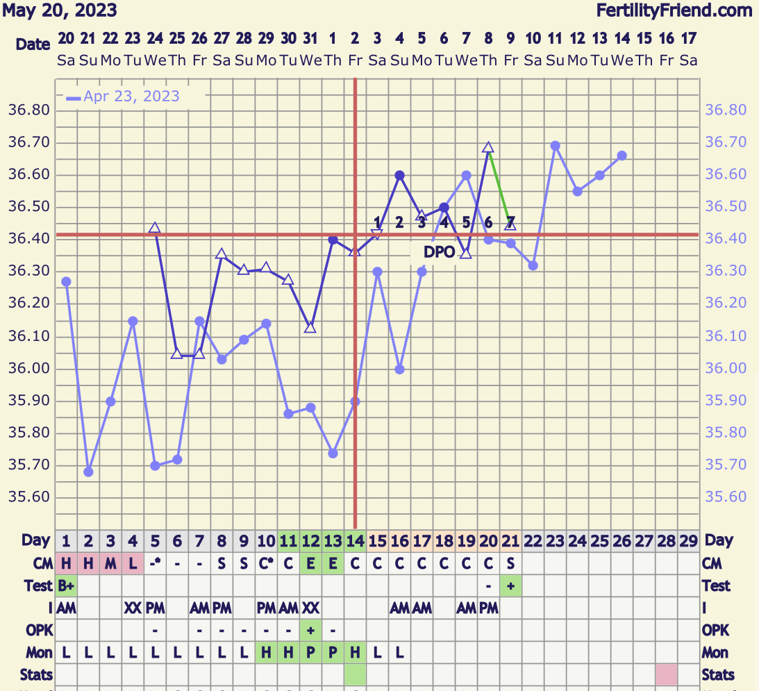 Så fikk jeg endelig krysset i FF. Den sier at jeg er 3DPO selv om jeg egentlig trodde jeg var 1DPO. Det gjør at EL har antakeligvis kom 2 dager før antatt og gjør at IKM går fra 17/6 til 14/6. Litt ekkelt når jeg ligger an til 25-dagers syklus men det er heller ikke ukjent for meg med en så kort syklus.