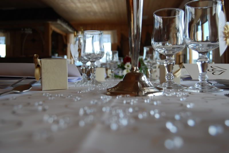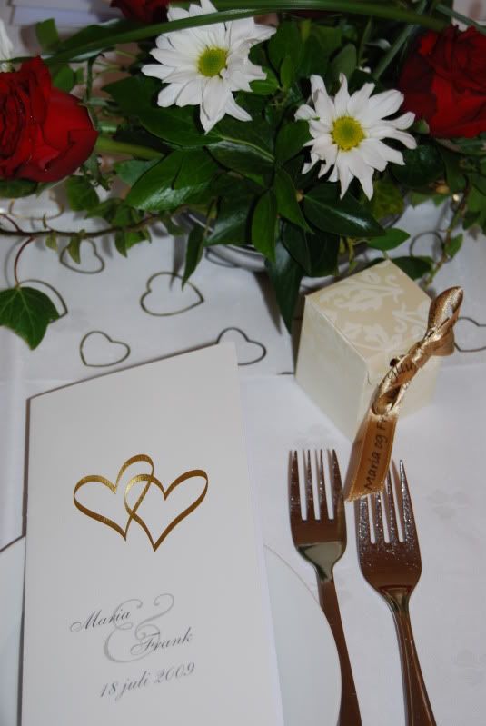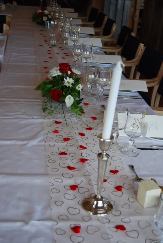 Hvit duk med løper som er gjennomsiktig, men med gullhjerter på. Røde hjerter som er strødd oppå der igjen på ene bordet, på de to andre hadde vi gjennomsiktige "diamanter". Blomsterdekorasjoner, favor bokser med litt godteri, og bryllupsprogrammet, og hvite lys.