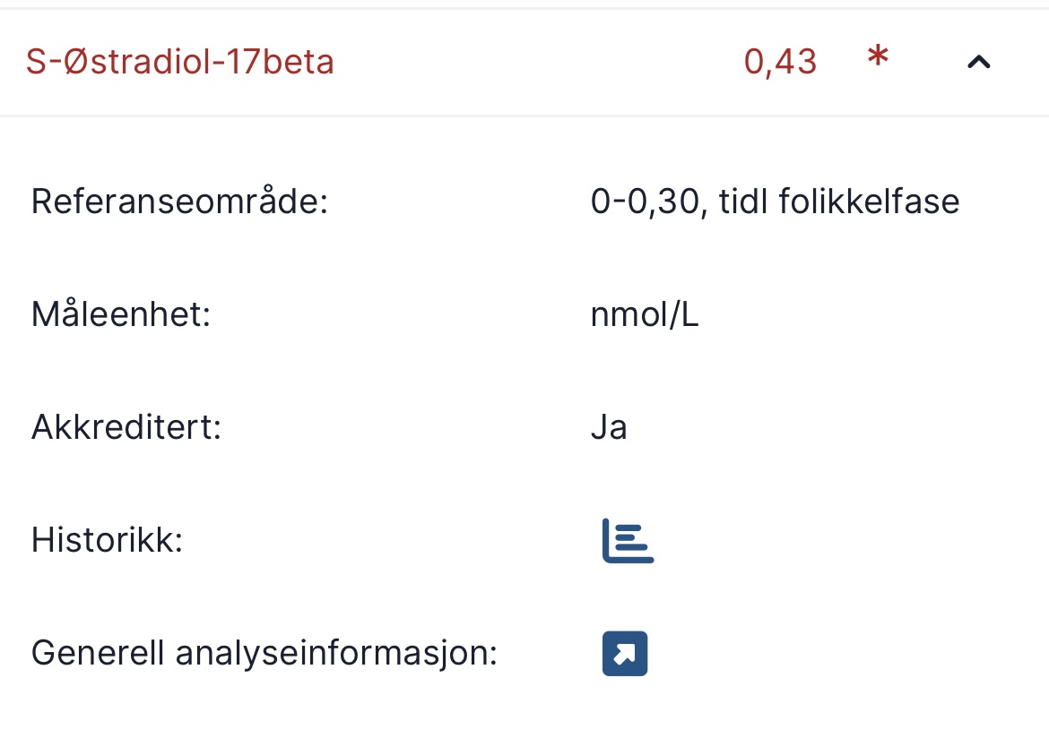 Hei! Jeg har ikke kunnskap på østradiol, men jeg jobber med å vurdere prøvesvar (dog for vann, ikke folk) og erfaringa mi fra det er at det er vanskelig å vurdere prøvesvar når man er ufaglært. Utrolig mange faktorer spiller inn, det er ofte slingringsmonn på referanseverdiene og i noen tilfeller kan en forhøyet verdi være OK pga noen andre parameter/svar. Andre ganger motsatt.