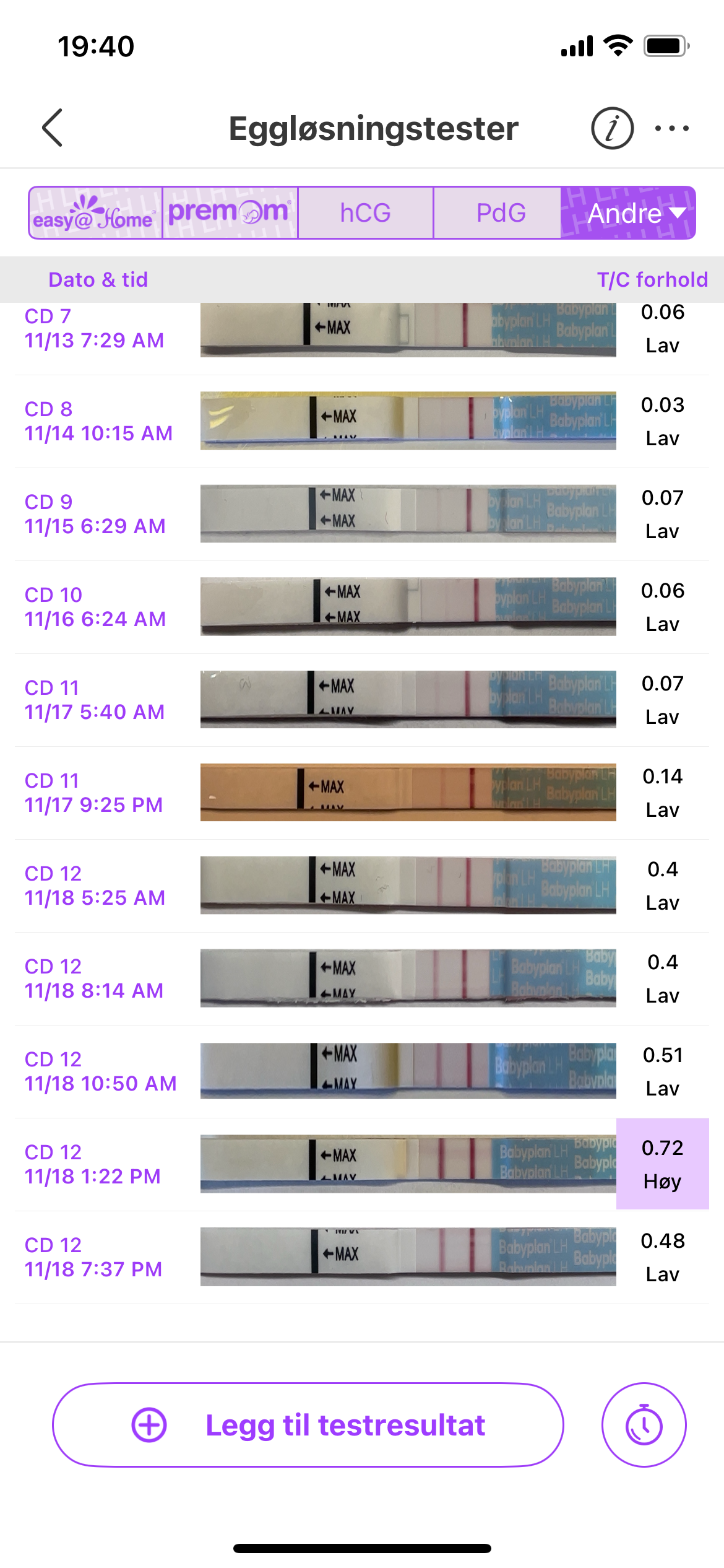 Mine sterkeste teststreker er kanskje som de som viser 0.5 eller deromkring. Men ser jo ut i fra klokkeslettene på testene dine at det godt kan hende at jeg misser toppene… Er jo ikke mange timer i mellom 0.51-0.78 og ned igjen hos deg heller, jeg har vel testet 3-4 ganger om dagen på det meste, men kan jo likevel ha klart å «bomme»Er det rimelig å anta at det har vært en LH-topp hvis streken har blitt sterkere og sterkere for så å bli svakere igjen og forsvinne helt i løpet av de neste par døgnene?