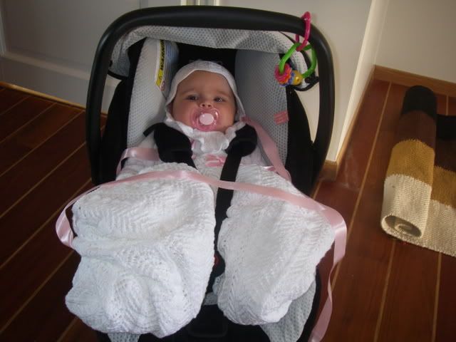 Ikke lett i bilsete med dåpskjole.... (hører med til historien at den inneholdt en stk nål som hun senere stakk seg på ett par ganger uten at vi forstod noe som helst... kunne kverket svigermor ja, stakkars jenta mi..)