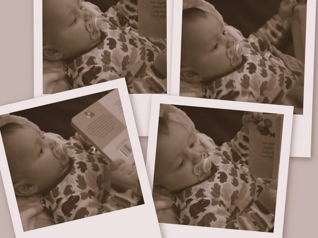 Så koselige bilder. [:)] Skjønn liten lesehest du har. [:D] Godt å begynne tidlig med bøker. Det er jo kjempekos. Petter elsker også å bli lest for, mens han ser bildene. [:)]