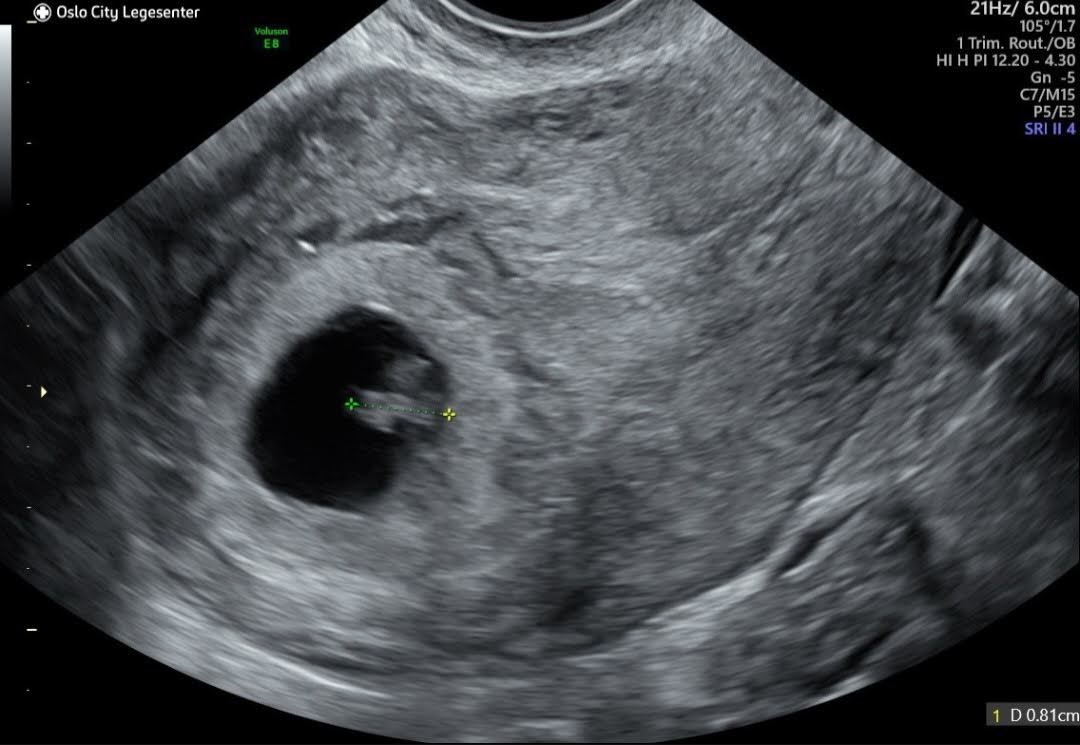 Legen min henviste meg til offentlig tidlig ultralyd forrige uke, og jeg har allerde fått time nå til fredag. Så da blir det to nære ultralyder denne uka, men det gjør meg ingen ting selv om jeg syns det er skummelt med ultralyd. Legger ved et ultralyd bilde selv om man ikke ser så mye. Lille bønna målte 8 mm og det stemmer helt med tanke på menstermin og ELVis vedlegget 377610