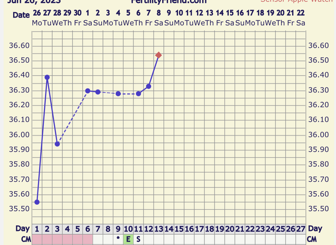 Litt vanskelig å tolke, særlig med så mange trekanter (at tempen er tatt på ulik tid). Bruker du strimler eller monitor i tillegg? Anbefaler det på det sterkeste! Evt fort deg å ta en el-test nå.Kan noen hjelpe meg å tolke denne? Har jeg hatt EL? Hadde positiv i går, men omtrent samme temp.