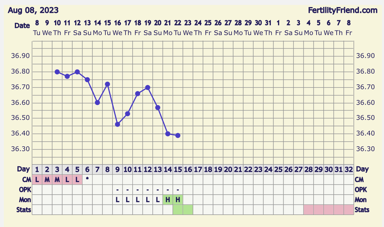 Bilde av tempene?Tempen min dippet enda lenger ned idag. Og jeg har vært oppblåst og kvalm i hele dag. Jeg skjønner ikke denne syklusen.