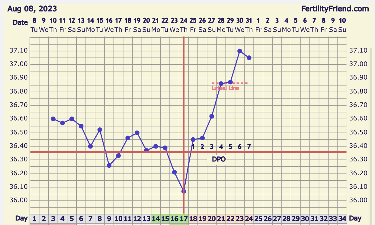 Litt krøll med tempinga i morges, for bikkja begynte å brekke seg og måtte løpe for å slippe henne ut. Så tempen var enten 37.11 klokka 0500 (korrigert til nesten 37.5) eller 37.05 klokka 0630 etter å ha sovna igjen. Jeg gikk for sistnevnte. Pregnancy monitoren stiger stadig på early signs da!Vis vedlegget 413597Vis vedlegget 413598