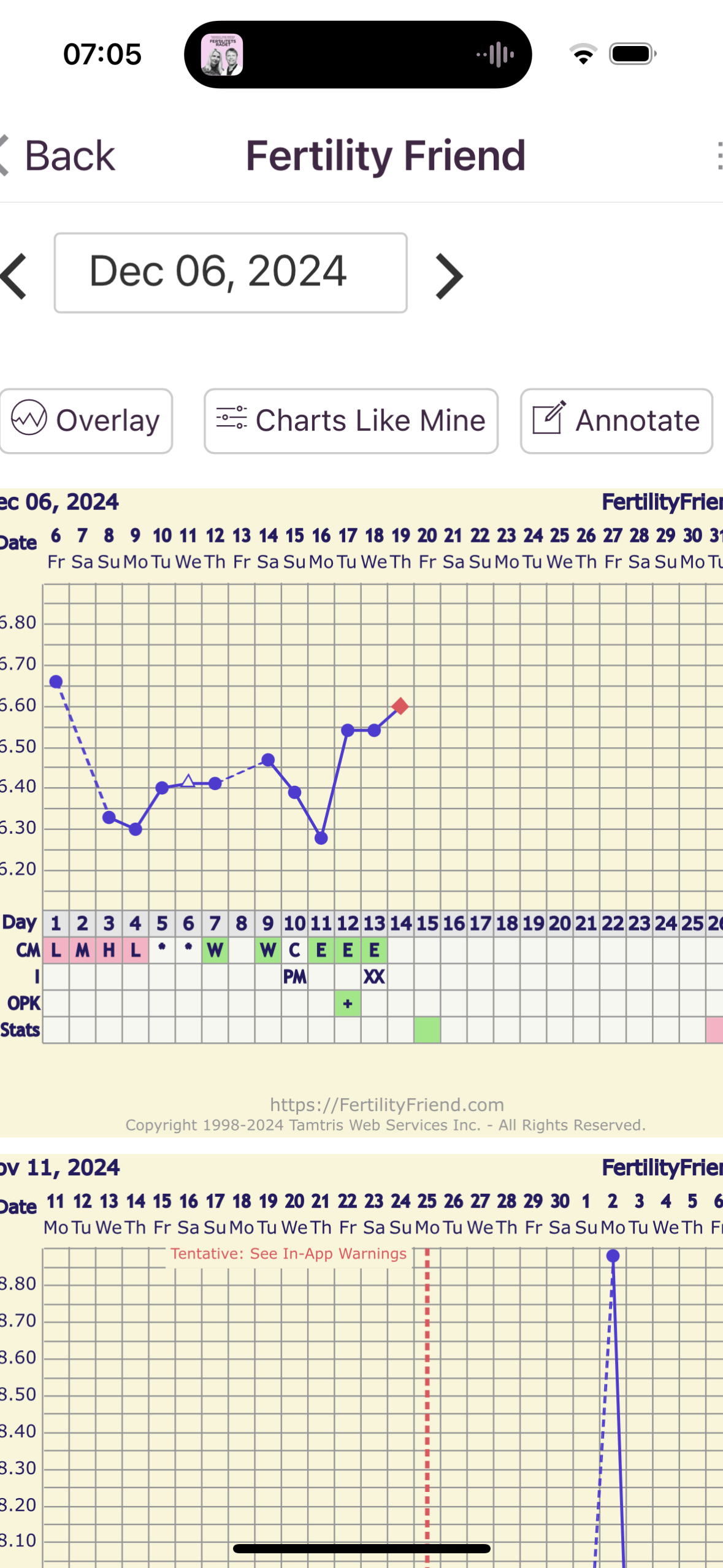 Du har logget vandig utflod samtidig som at temperaturen har droppet, da kan den gi tentativ grønt lys for du kan være fertil. Den ser an hva du logger. Det skjer med meg og for jeg har som regel to dropp i kurven min en gang rundt dag 10 og neste når EL er.