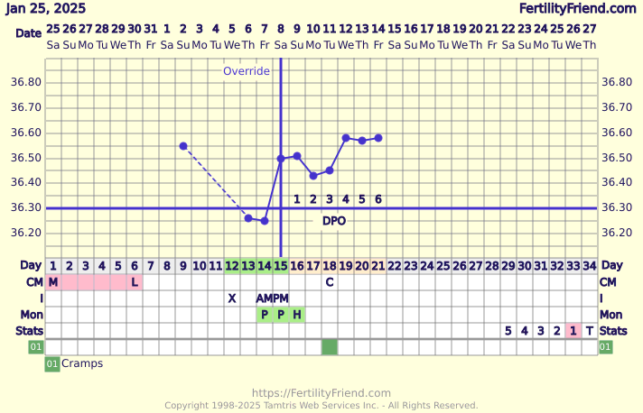 Jeg synes charten din tydeligere ut nå som det har gått noen dager. :) Men du har valgt å bruke override, hvorfor det? Utifra tempen din, så er det tydelig at eggløsning var på dag 14. :) Jeg har god erfaring med å tempe oralt, og synes det gir en like jevn og pålitelig chart som vaginalt. Bare pass på å ha termometeret på samme plass inni munnen hver dag. :)