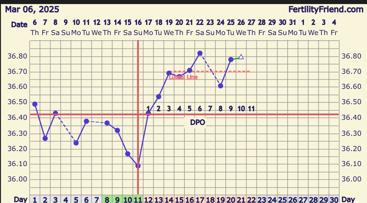 Blir eggløsning i morgen, så spent på hvordan den blir daDen stiger etter eggløsning ihvertfall![]()
