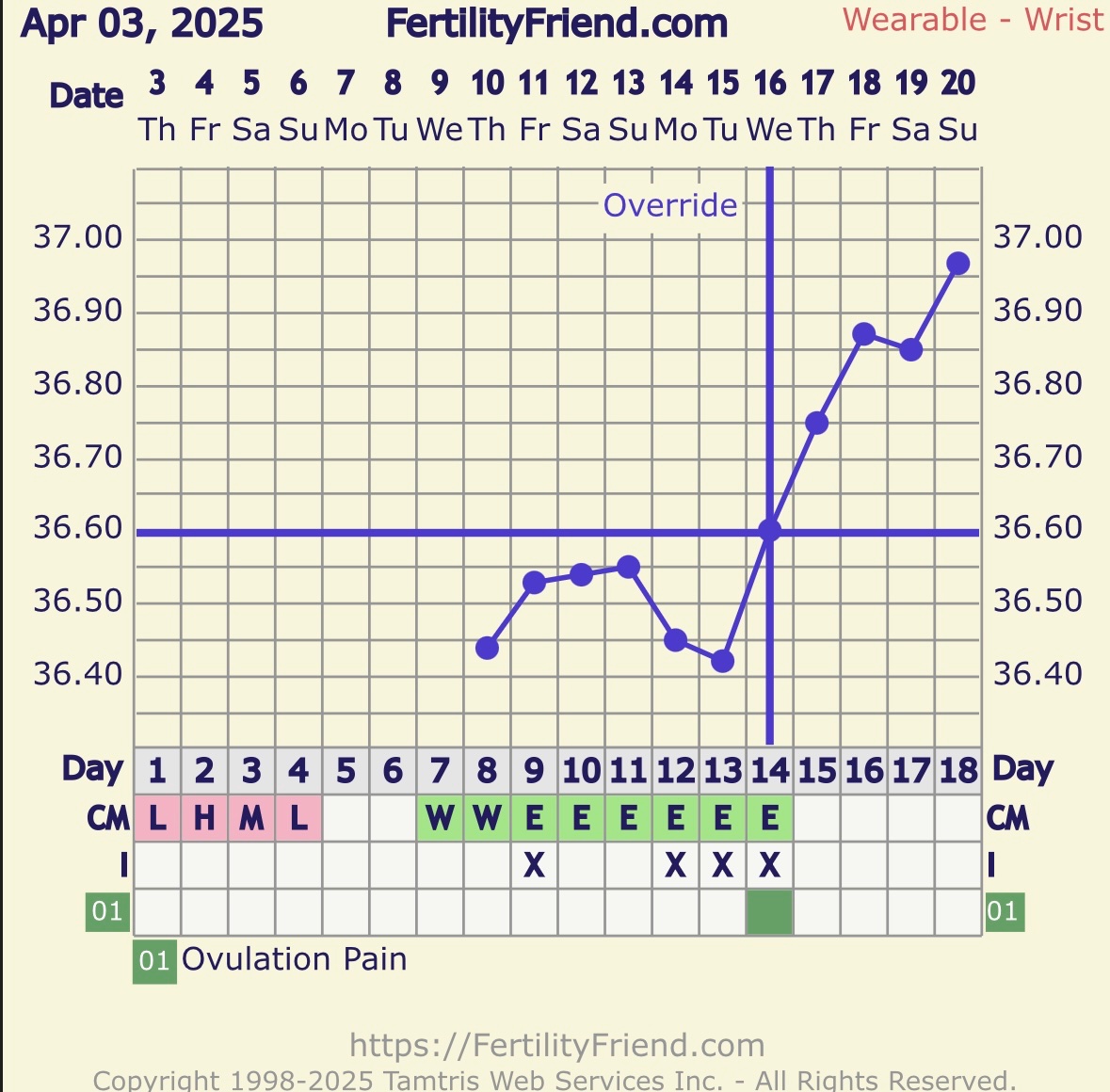 3. “Override”-linjen: Fertility Friend har overstyrt og satt eggløsning på CD14, som gir mening basert på både temp og symptomer.