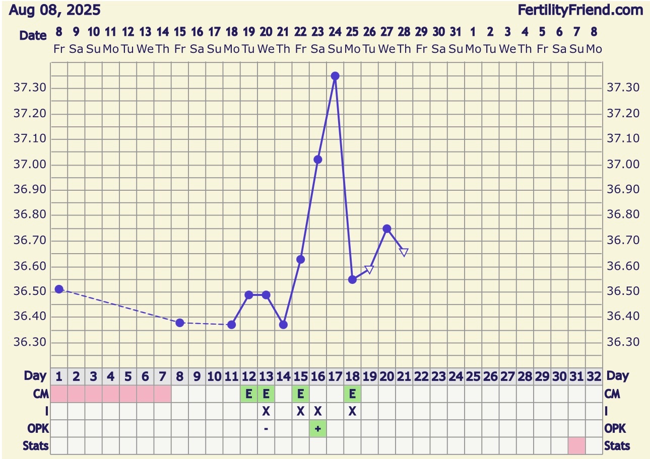 Vet ikke om det gir mening? Føler det var litt vanskelig å forklare.Tusen takk for utfyllende svar! Og ja, jeg var på fest på lørdag, så da discarder jeg denHar du drukket alkohol i den helgen hvor tempen er høyest?Det kan isåfall forhøye tempen. Ut ifr hva jeg ser, så har du hatt eggløsning, siden tempen etter positiv test er høyere enn før. Ganske tydelig også, men tempen din fredag, lørdag og søndag passer ikke inn, og er helt sikkert falskt forhøyet. Jeg har aldri sett noen med en så markant stigning, så jeg ville faktisk satt «temperature discarded» på fredag, lørdag og søndag. Da vil du se at du har en stigning likevel, men det vil være vanskelig for FF å sette kryss. Du vil uansett ikke få noe kryss når de temperaturen er så høye før eggløsning.