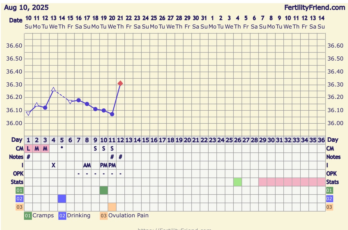 Jeg skjønner ingenting denne syklusen.. Positiv test og masse symptomer (smerter og eggehvite, som nå er borte) - men ut i fra tempen å dømme har det ikke skjedd noe? :(IMG_6089.jpeg