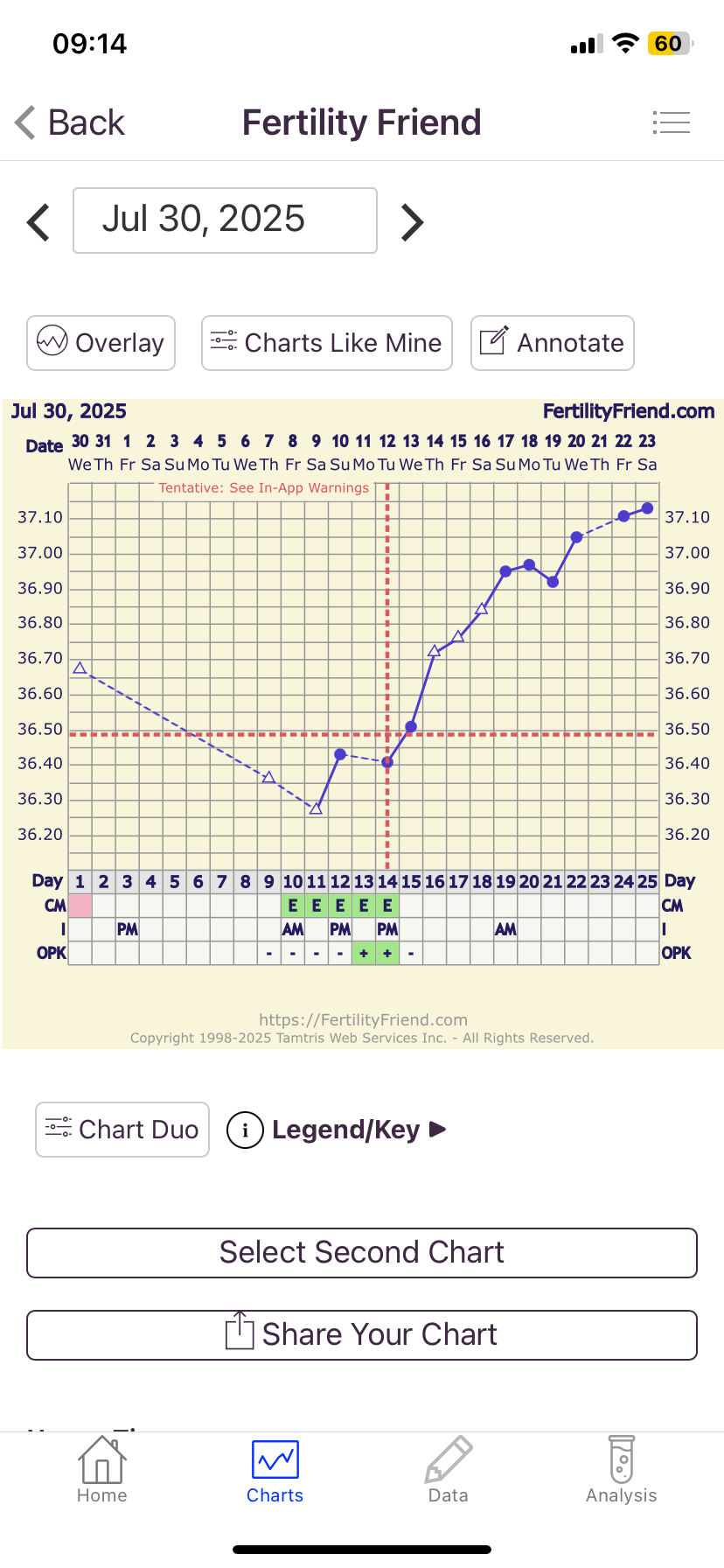 Basert på denne grafen, kan eggløsning ha vært på cd15 og ikke cd14 som angitt? Eltest ble positiv cd13, tidlig kveld. Litt sterkere på cd14, testet da rundt 17, og så tydelig negativ rundt klokka 13 cd15.