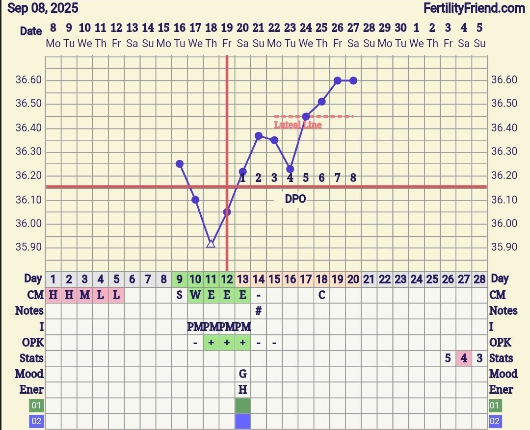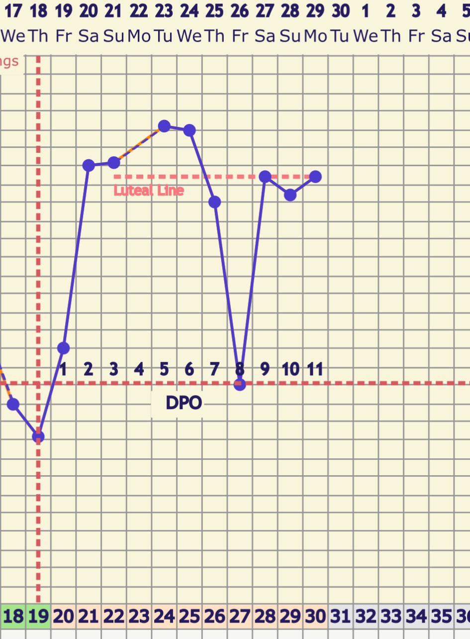 Noen som kan se om det stemmer att jeg hadde eggløsning dag 19 eller om det var dag 20? :happy:Negativ test idag,burde vært positiv om tempdrop 8 dpo var en festedipp? Eller er den tempdropen for stor for å være det ?
