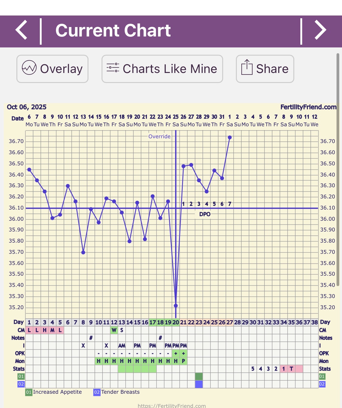 Denne syklusen har jeg hatt senere eggløsning enn vanlig og et enormt dropp før eggløsning og høyt opp etter. Veldig glad for å se at tempen holder seg stabil over coverline. Hvis jeg får TR denne syklusen skal jeg få skylt egglederne og vi blir henvist til IVF. Håper så innderøig at det snart sitter. Temp måling har heldigvis blitt en automatisk vane og ser virkelig nytten av den.