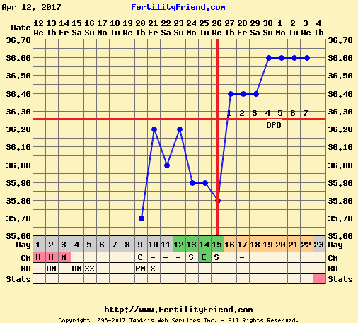 Dette er slags patetisk forsøk på temphopp? Hmpf. Alt tyder på at eggløsningen var igår, bortsett fra at tempen ikke akkurat har gjort den helt store økningen. Google sier at det kan være at kroppen reagerer seint på progesteronet. Og om eggløsningrn var seint på kvelden/tidlig natt så har ikke kroppen hatt mange timer på seg.