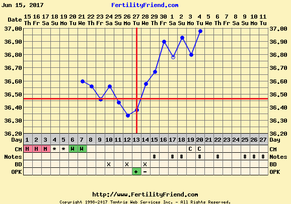 Tempen i dag var den høyeste i syklusen hittil. Men, ser at i dagene før el så var tempen over den rød streken. Vet ikke om dette betyr noe eller ikke, men antar at om tempen synker ned til ca det nivået så kommer sikkert tr...:hungover: