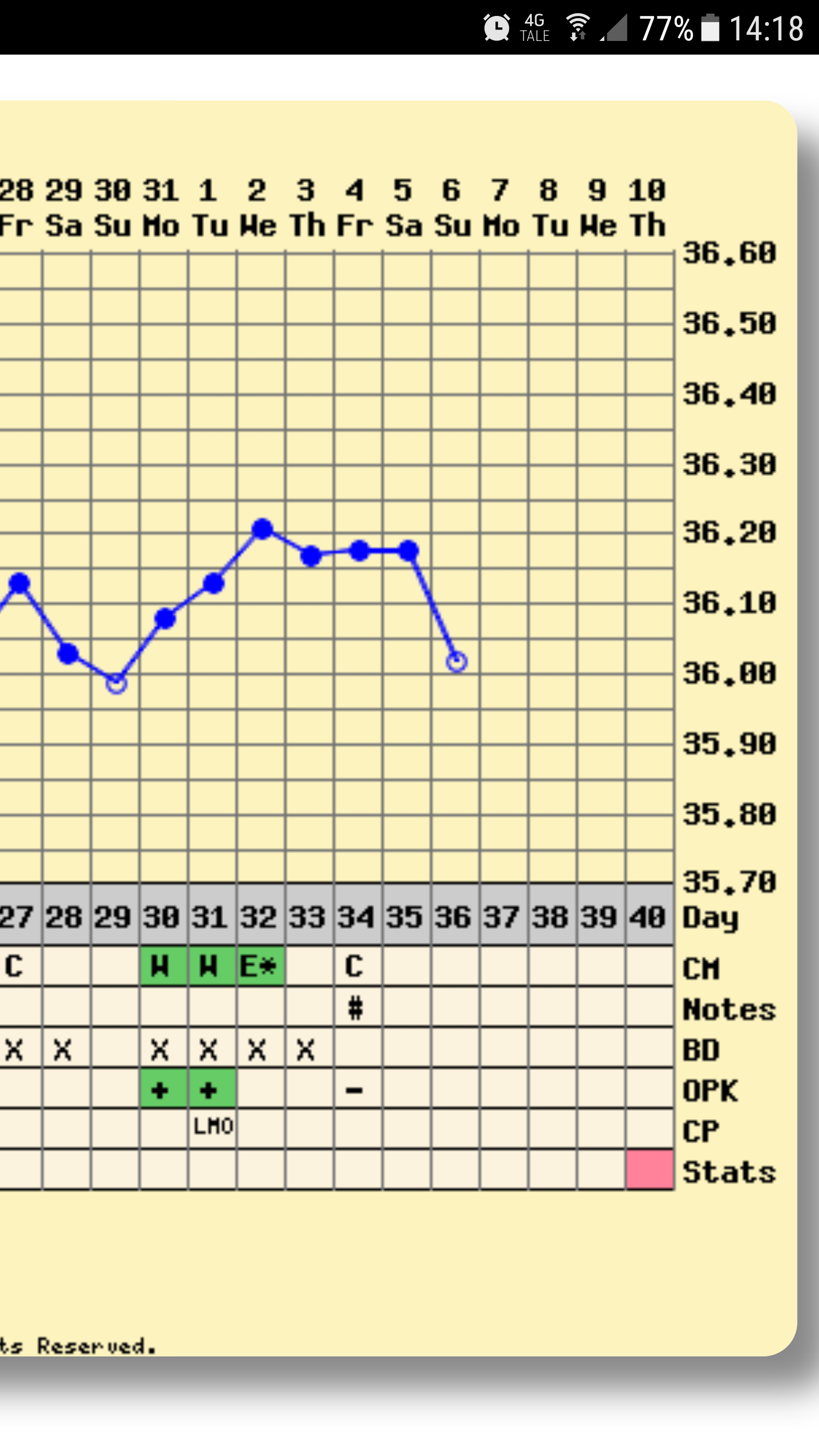 Vis vedlegget 230274 Fikk først varsel om EL på dag 30, men det gikk bort igjen pga. for lav temp. Måler under tungen. Klarer likevel ikke helt å slippe håpet pga. EL testene, og skulle ønske at jeg hadde en festedip i dag. Føler ikke LC måler helt skikkelig under tungen og at målingene er feil.