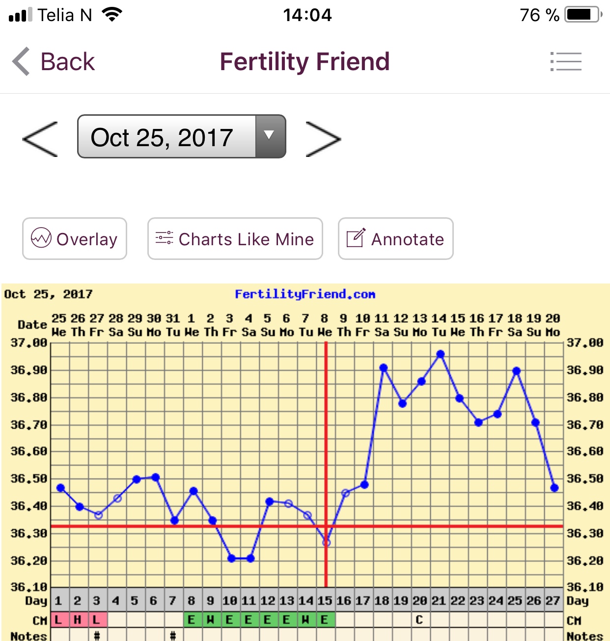 Dagens. Følger de andre kurvene fint med fall i temp på 5dpo. Eneste forskjellen er at hele dpo-kurven ligger høyere enn vanlig. Venter i spenning på fortsettelsen... [emoji1303]