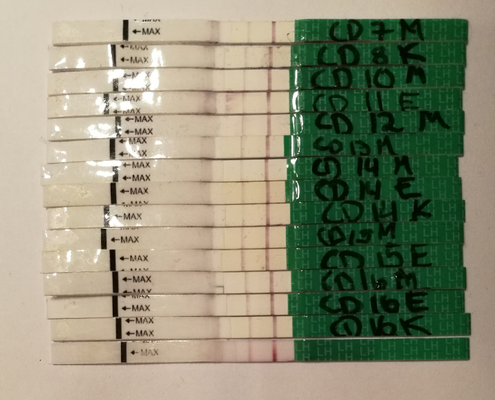 8/9 dpo. Ny tempstigning. Kurven ser lovende ut. Tester er blenda, men jeg skimter "noe", som jeg tror er litt skygge etter der streken egentlig skal være.