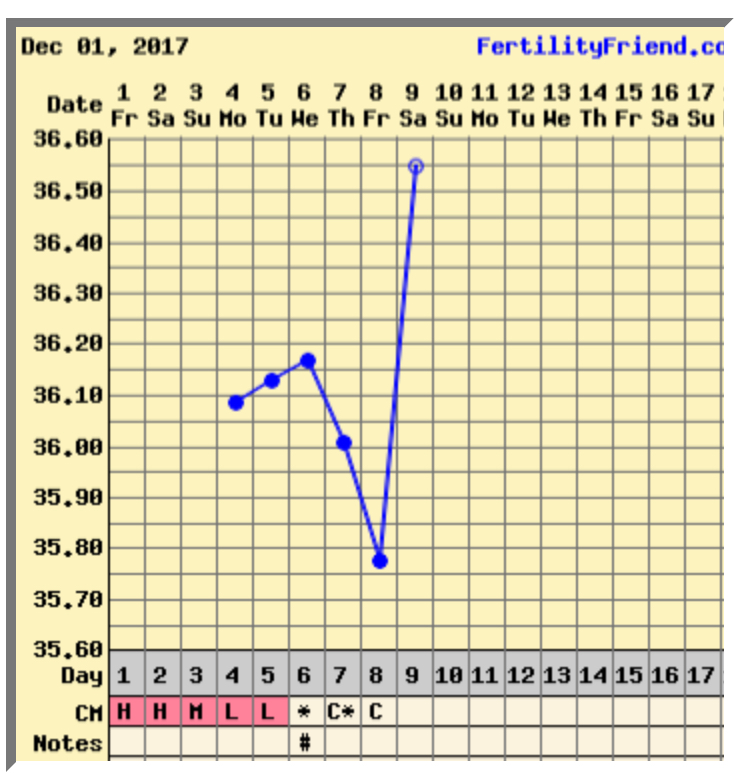 Tempen i dag tidlig. Testet selvfølgelig i dag også. Negativ 9 dpo. Muligens jeg skimtet noe veldig veldig svakt. Jeg er så utrolig spent. Forrige mnd fikk jeg TR 10 dpo. Så har egentlig IKM i morgen ☺