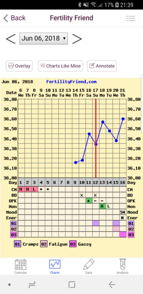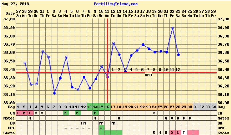 Ikm i dag. Våknet kl.3 i natt, så tempen i dag blir helt feil. Den har nok egentlig ikke gått ned. Hadde over 37 da jeg tempet etter å ha sovet 1-2timer på morgenen, og jeg føler meg ganske varm. Fortsatt ingen tegn til menstruasjon, men negativ graviditetstest i dag [emoji58] Tror ikke det er noen graviditet, men skjønner ikke hvorfor menstruasjonen ikke kommer. Pleier vanligvis å spotte flere dager i forkant.